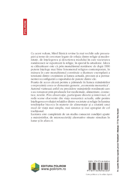 Cu acest volum, Mirel Bănică revine la mai vechile sale preocupări și teme de cercetare legate de relația dintre religie și modernitate, de înțelegerea și descrierea modului în care societatea românească se raportează la religie, în special la ortodoxie. Ideea sa călăuzitoare este că prin monahismul românesc de după 1990 putem înțelege mai bine fenomenul religios contemporan, în măsura în care monahismul constituie o ilustrare exemplară a tensiunii dintre creștinism și lumea actuală, precum și a permanentei reconfigurări a raportului de putere dintre ele.