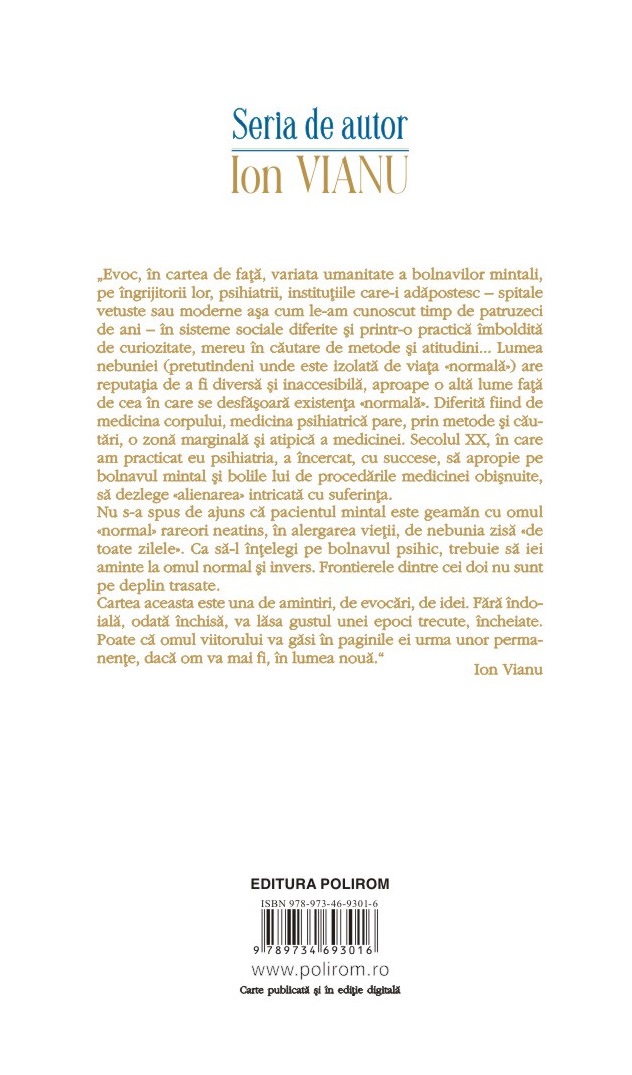 Evoc, în cartea de față, variata umanitate a bolnavilor mintali, pe îngrijitorii lor, psihiatrii, instituțiile care-i adăpostesc – spitale vetuste sau moderne așa cum le-am cunoscut timp de patruzeci de ani – în sisteme sociale diferite și printr-o practică îmboldită de curiozitate, mereu în căutare de metode și atitudini... Lumea nebuniei (pretutindeni unde este izolată de viața «normală») are reputația de a fi diversă și inaccesibilă, aproape o altă lume față de cea în care se desfășoară existența «normală». Diferită fiind de medicina corpului, medicina psihiatrică pare, prin metode și căutări, o zonă marginală și atipică a medicinei. Secolul XX, în care am practicat eu psihiatria, a încercat, cu succese, să apropie pe bolnavul mintal și bolile lui de procedările medicinei obișnuite, să dezlege «alienarea» intricată cu suferința.
