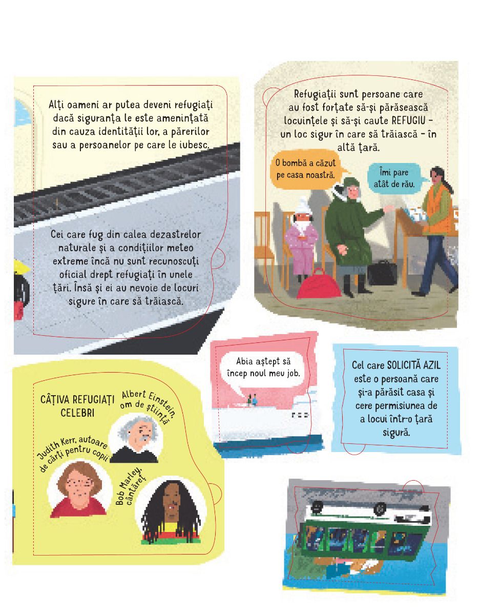 Cartea este special făcută pentru cei mici să învețe și să descopere lumea prin joacă. Ce se întâmplă atunci când acasă nu mai este un loc sigur? Milioane de refugiați din întreaga lume se confruntă cu această întrebare sfâșietoare. Și răspunsurile sunt dificile – însă putem ajuta cu toții aflând mai multe și punând întrebări.