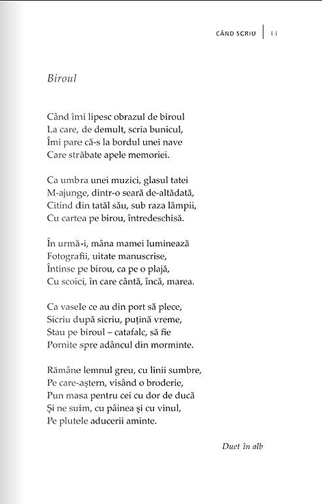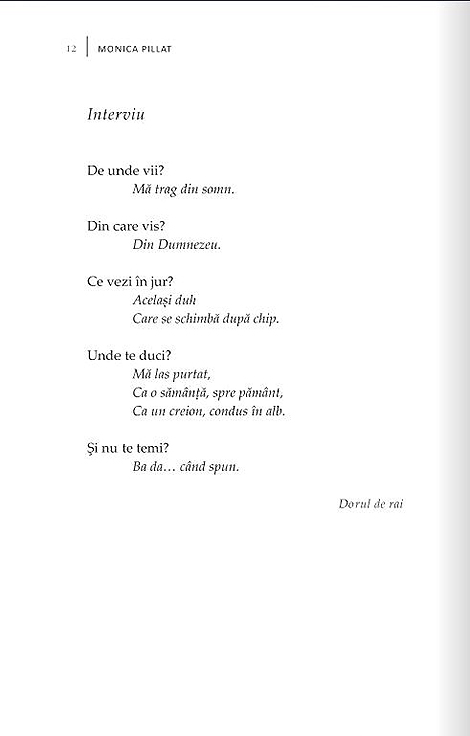 „Prezenta antologie cuprinde o selecţie din versurile publicate în volumele Corăbii, Ed. Cartea Românească, 1970, Imaginaţia ecoului, Ed. Cartea Românească, 1981, Pluralul ca o veghe, Ed. Eminescu, 1989, Sentinţe suspendate, Ed. Albatros, 1998, Dorul de rai, Ed. Universalia, 2005, şi Duet în alb, Ed. Humanitas, 2015, la care am adăugat şi câteva texte extrase din cartea de proză şi poezie Drumul spre Emaus, Ed. Vremea, 2002, şi din 45 de poeme inedite.“ – MONICA PILLAT