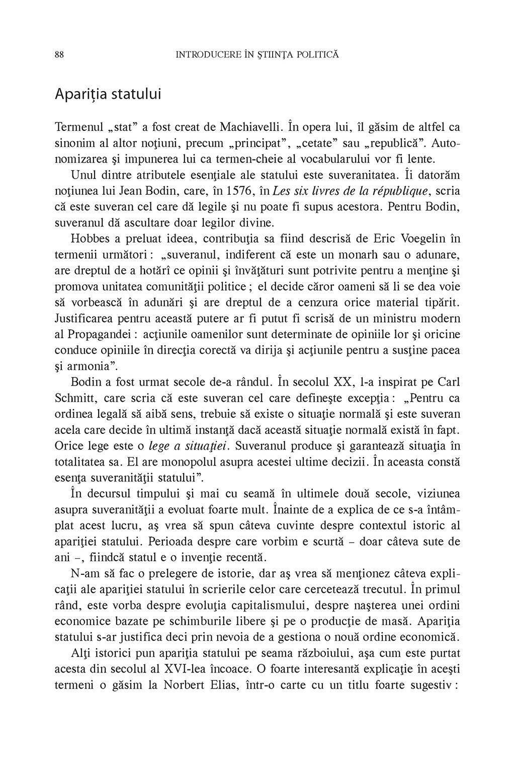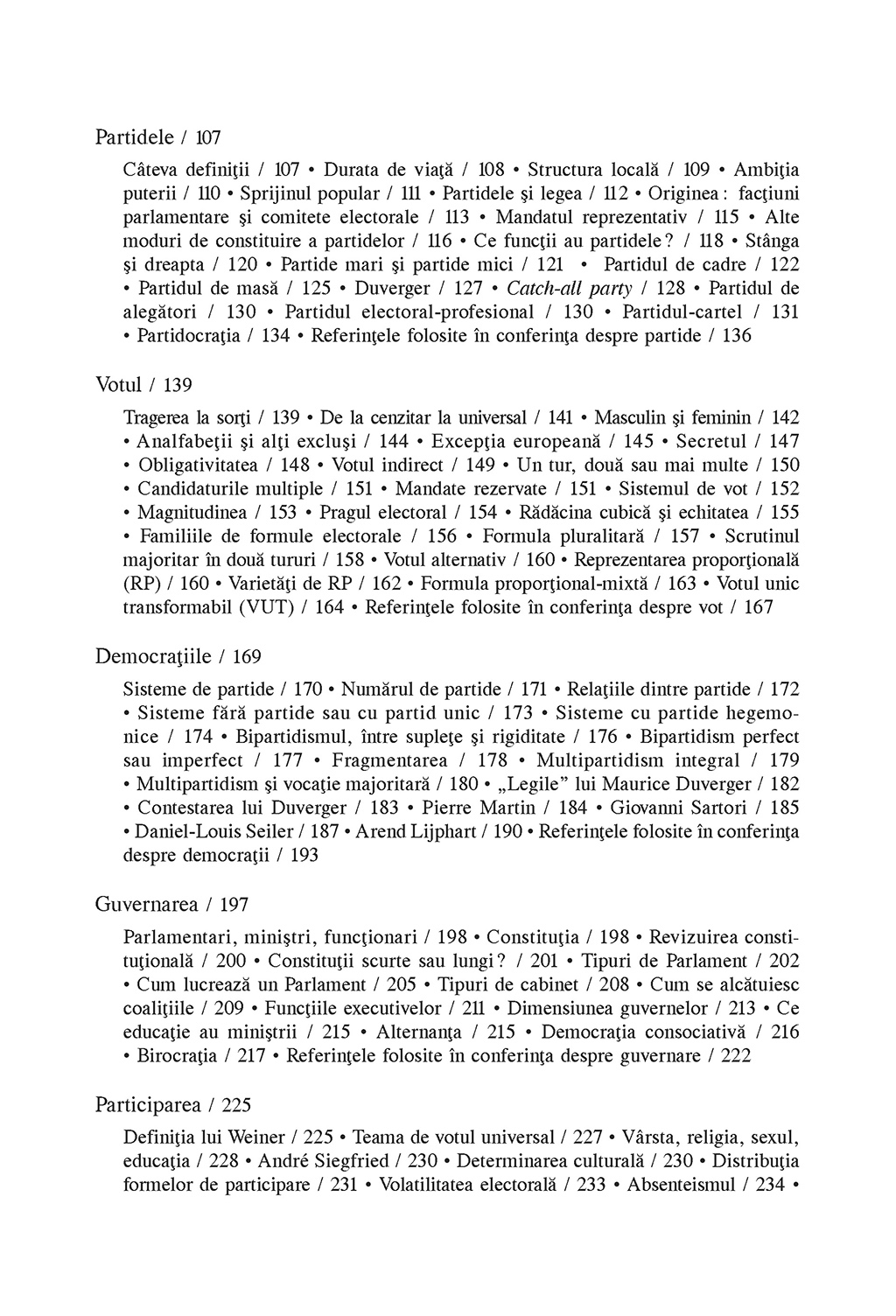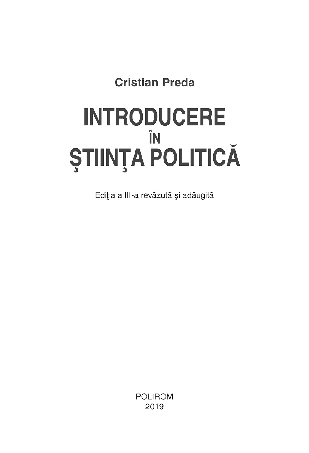 De ce există guverne? Cum funcţionează acestea? Avem nevoie de partide politice? Dincolo de momentul alegerilor, pot cetăţenii să influenţeze deciziile liderilor lor? Sînt doar cîteva dintre întrebările esenţiale la care această introducere în materia clasică a ştiinţei politice oferă răspunsuri. Cele mai importante instrumente analitice necesare pentru a explica funcţionarea regimurilor politice, ca şi principalele teme ce permit o mai bună înţelegere a societăţilor contemporane sunt discutate pe baza referirilor la textele fundamentale ale ştiinţei politice. Construit în jurul unor concepte-cheie des uzitate, dar ale căror înţelesuri rămîn insuficient cunoscute publicului larg, volumul e un excelent instrument de lucru atît pentru studenţii în ştiinţe politice, cît şi pentru jurnalişti şi toţi cei interesaţi de viaţa politică în general.