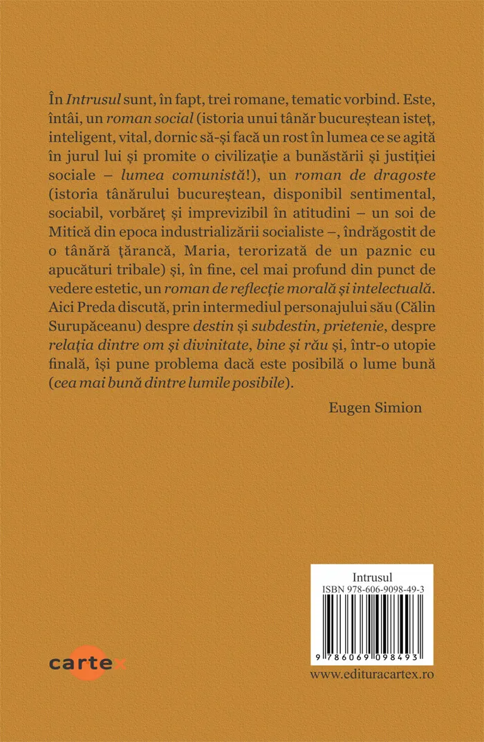 Textul editat stiintific si studiul lui Eugen Simion sunt argumentele pentru care aceasta editie din Intrusul va fi editia de referinta. In Intrusul sunt trei romane, un roman social, un roman de dragoste si un roman de reflectie morala si intelectuala. Astfel ca, Intrusul este un roman camusian in care compromisul cu ideile este minim, iar tezele oficiale ale regimului totalitar sunt combatute, rasturnate din interior, cu abilitate si o dialectica specific predista.