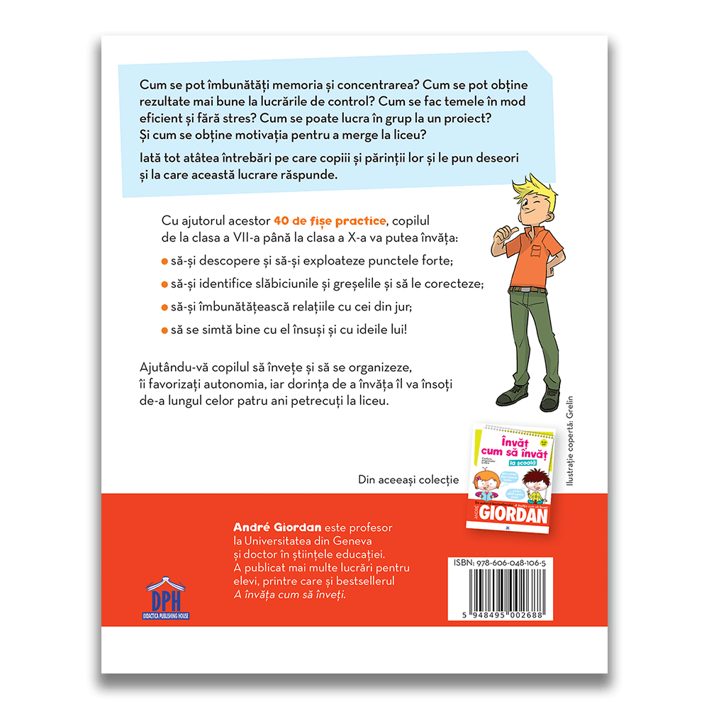 Plecând de la sfaturi, sugestii, activităţi pe care această carte ţi le propune, îţi vei putea însuși metode de lucru eficiente, vei descoperi unele noi și, mai ales, le vei putea elabora pe cele care ţi se potrivesc cel mai bine. Părinţii tăi vor găsi și ei la sfârșitul cărţii sfaturi care le sunt destinate. Încurajează-i să le citească! Apoi va fi rândul tău să acţionezi!