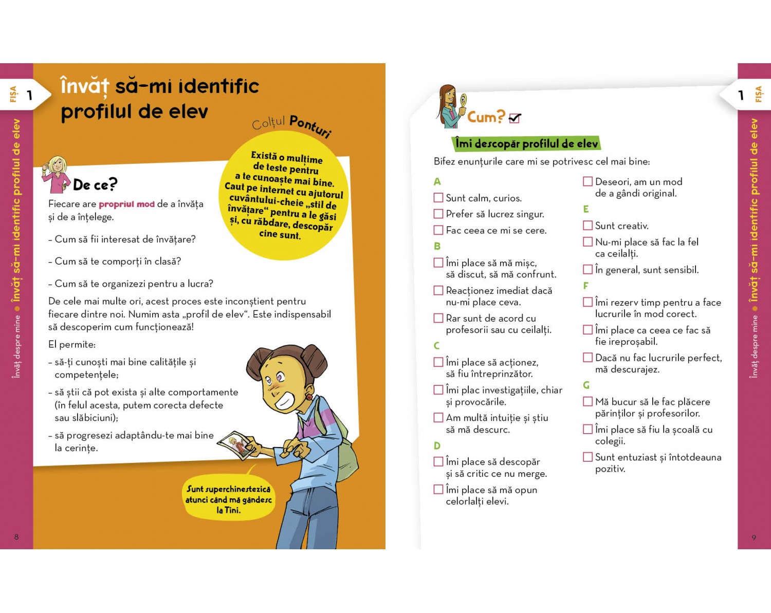 Cartea este structurată în cinci părți principale: Învăț despre mine, Învăț cum să învăț mai bine, Învăț să acumulez cunoștințe specifice, Învăț să mă organizez mai bine, Învăț să socializez. La final regăsiți zece sfaturi utile date părinților pentru a-și susține cel mai bine copiii.