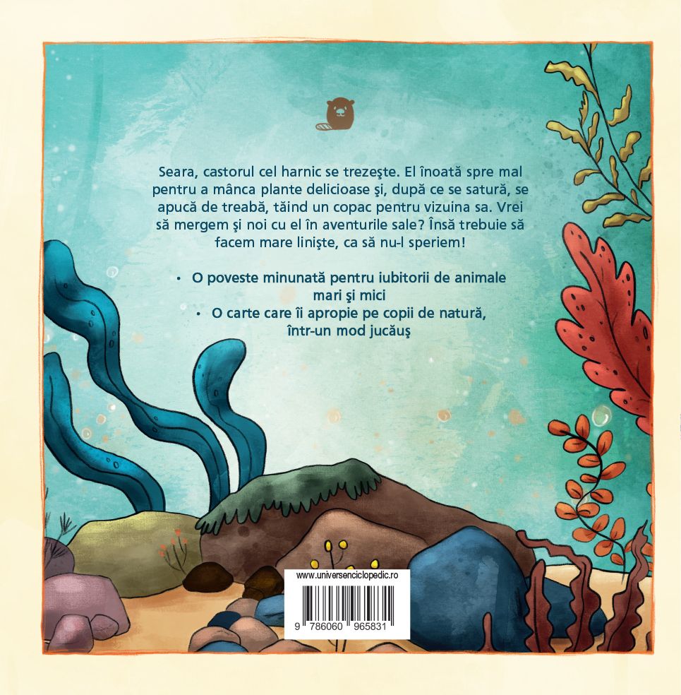 Seara, castorul cel harnic se trezește. El înoată spre mal pentru a mânca plante delicioase și, după ce se satură, se apucă de treabă, tăind un copac pentru vizuina sa.