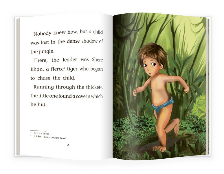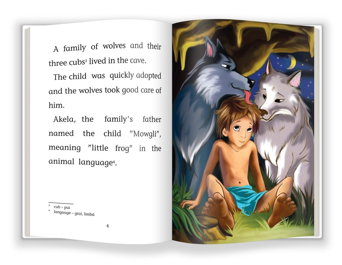 Peripețiile micului Mowgli și ale prietenilor săi din junglă, rezumate într-o carte creată special pentru copiii care vor să citească texte tot mai lungi în limba engleză.