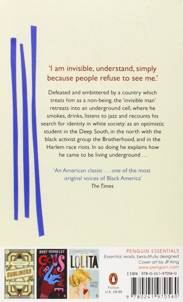 Defeated and embittered by a country which treats him as a non-being, the 'invisible man' retreats into an underground cell, where he smokes, drinks, listens to jazz and recounts his search for identity in white society: as an optimistic student in the Deep South, in the north with the black activist group the Brotherhood, and in the Harlem race riots. And explains how he came to be living underground...