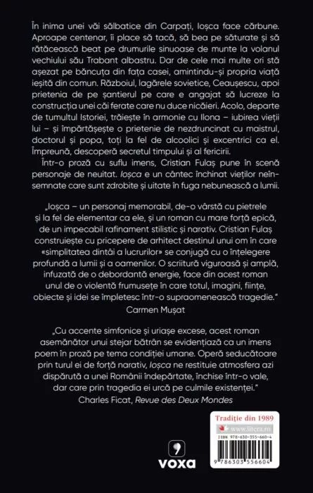 „Ioșca – un personaj memorabil, de-o vârstă cu pietrele și la fel de elementar ca ele, și un roman cu mare forță epică, de un impecabil rafinament stilistic și narativ. Cristian Fulaș construiește cu pricepere de arhitect destinul unui om în care «simplitatea dintâi a lucrurilor» se conjugă cu o înțelegere profundă a lumii și a oamenilor. O scriitură viguroasă și amplă, infuzată de o debordantă energie, face din acest roman unul de o violentă frumusețe în care totul, imagini, ființe, obiecte și idei se împletesc într-o supraomenească tragedie.“ Carmen Mușat