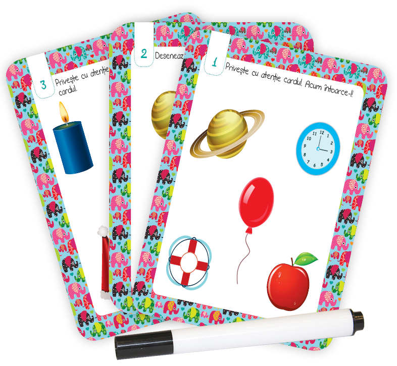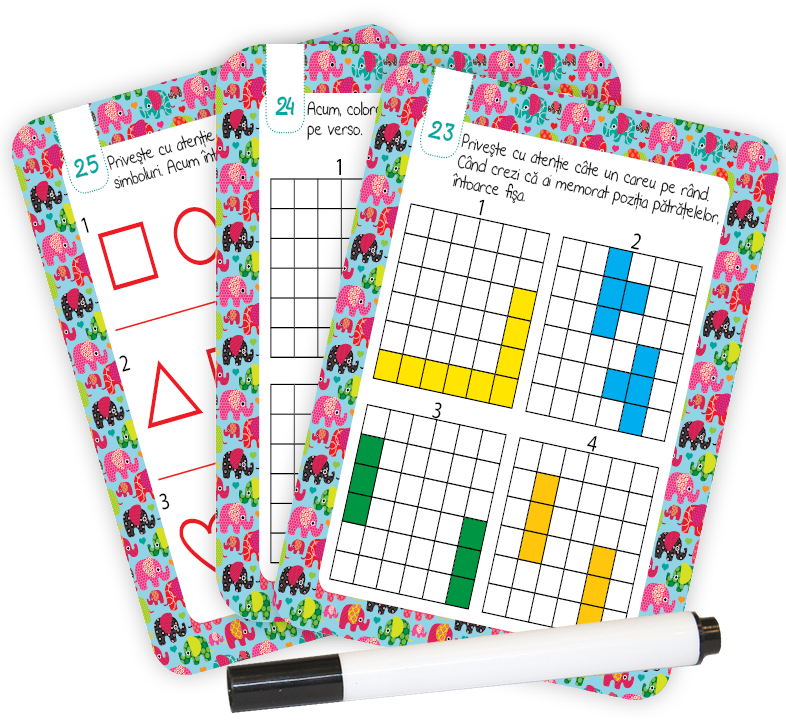 Cardurile educative IQ FUN - Memorie pun la dispoziția copilului o gamă variată de exerciții care facilitează asimilarea și reținerea anumitor cunoștințe.Cu ajutorul acestor fișe reutilizavile ce conțin jocuri de inteligenta, copilul își va antrena capacitatea de concentrare, memoria, inteligența și motricitatea fină. Pachetul este destinat copiilor de 5-6 ani.