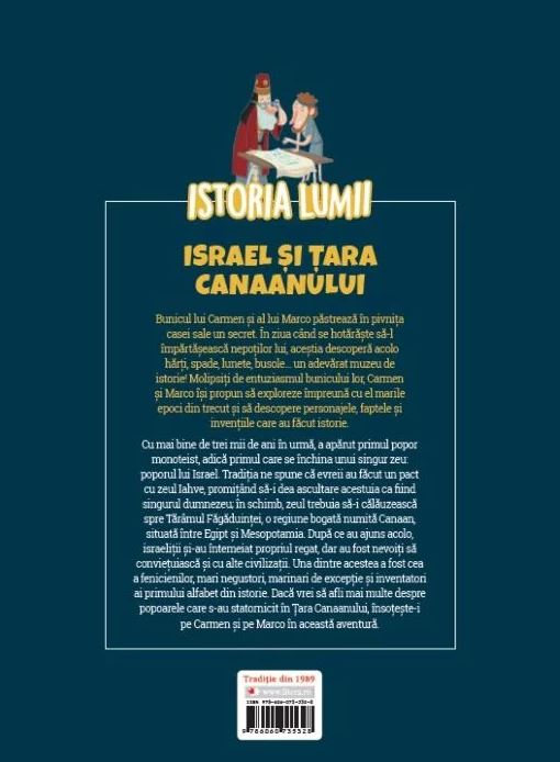 Cu mai bine de trei mii de ani în urmă, a apărut primul popor monoteist, adică primul care se închina unui singur zeu: poporul lui Israel. Tradiția ne spune că evreii au făcut un pact cu zeul Iahve, promițând să-i dea ascultare acestuia ca fiind singurul dumnezeu; în schimb, zeul trebuia să-i călăuzească spre Tărâmul Făgăduinței, o regiune bogată numită Canaan, situată între Egipt și Mesopotamia. După ce au ajuns acolo, israeliții și‑au întemeiat propriul regat, dar au fost nevoiți să conviețuiască și cu alte civilizații. Una dintre acestea a fost cea a fenicienilor, mari negustori, marinari de excepție și inventatori ai primului alfabet din istorie. Dacă vrei să afli mai multe despre popoarele care s-au statornicit în Țara Canaanului, însoțește-i pe Carmen și pe Marco în această aventură.
