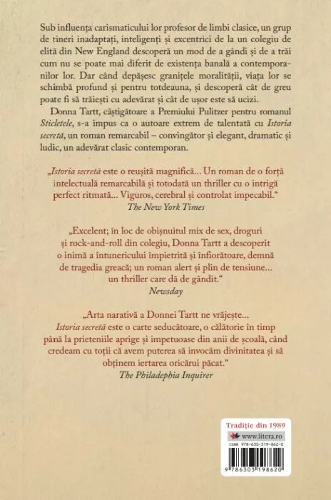 Donna Tartt, câștigătoare a Premiului Pulitzer pentru romanul Sticletele, s -a impus ca o autoare extrem de talentată cu Istoria secretă, un roman remarcabil – convingător și elegant, dramatic și ludic, un adevărat clasic contemporan.
