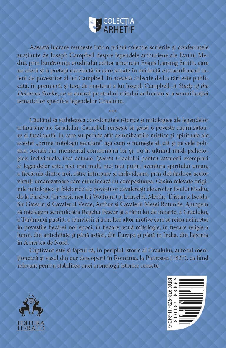 Cautand sa stabileasca coordonatele istorice si mitologice ale legendelor arthuriene ale Graalului, Campbell reuseste sa teasa o poveste cuprinzatoare si fascinanta, in care surprinde atat semnificatiile mistice si spirituale ale acestei „prime mitologii seculare”, asa cum o numeste el, cat si pe cele politice, sociale din momentul consemnarii lor si, nu in ultimul rand, psihologice, individuale, inca actuale. Questa Graalului pentru cavalerii exemplari ai legendelor este, nici mai mult, nici mai putin, aventura spiritului uman, a fiecaruia dintre noi, catre intrupare si individuare, prin dobandirea acelor virtuti umanizatoare care culmineaza cu compasiunea. Gasim relevate originile mitologice si folclorice ale povestilor cavaleresti ale eroilor Evului Mediu, de la Parzival (in versiunea lui Wolfram) la Lancelot, Merlin, Tristan si Isolda, Sir Gawain si Cavalerul Verde, Arthur si Cavalerii Mesei Rotunde. Ajungem sa intelegem semnificatia Regelui Pescar si a ranii lui de moarte, a Graalului, a Taramului pustiit, a reinvierii si a multor altor motive care se reiau neincetat in povestile fiecarei noi epoci, in fiecare noua mitologie, in fiecare religie a lumii, din antichitate si pana astazi, din Europa si pana in India, din Japonia in America de Nord.