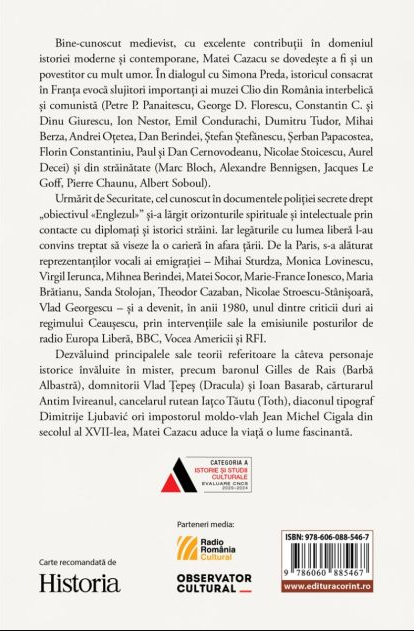 Dezvăluind principalele sale teorii referitoare la câteva personaje istorice învăluite în mister, precum baronul Gilles de Rais (Barbă Albastră), domnitorii Vlad Țepeș (Dracula) și Ioan Basarab, cărturarul Antim Ivireanul, cancelarul rutean Iațco Tăutu (Toth), diaconul tipograf Dimitrije Ljubavić ori impostorul moldo-vlah Jean Michel Cigala din secolul al XVII-lea, Matei Cazacu aduce la viață o lume fascinantă.