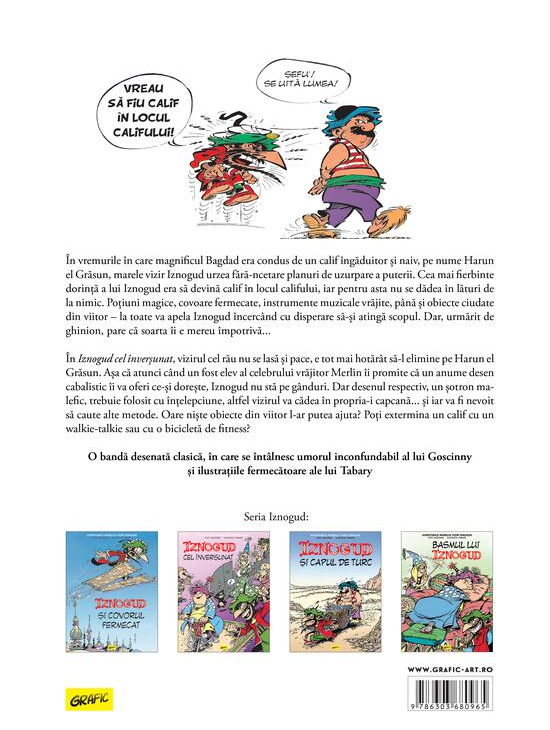 În vremurile în care magnificul Bagdad era condus de un calif îngăduitor și naiv, pe nume Harun el Grăsun, marele vizir Iznogud urzea fără-ncetare planuri de uzurpare a puterii. Cea mai fierbinte dorință a lui Iznogud era să devină calif în locul califulu, iar pentru asta se dădea în lături de la nimic. Poțiuni magice, covoare fermecate, instrumente muzicale vrăjite, până și obiecte ciudate din viitor – la toate va apela Iznogud încercând cu disperare să-și atingă scopul. Dar, urmărit de ghinion, pare că soarta îi e mereu împotrivă...