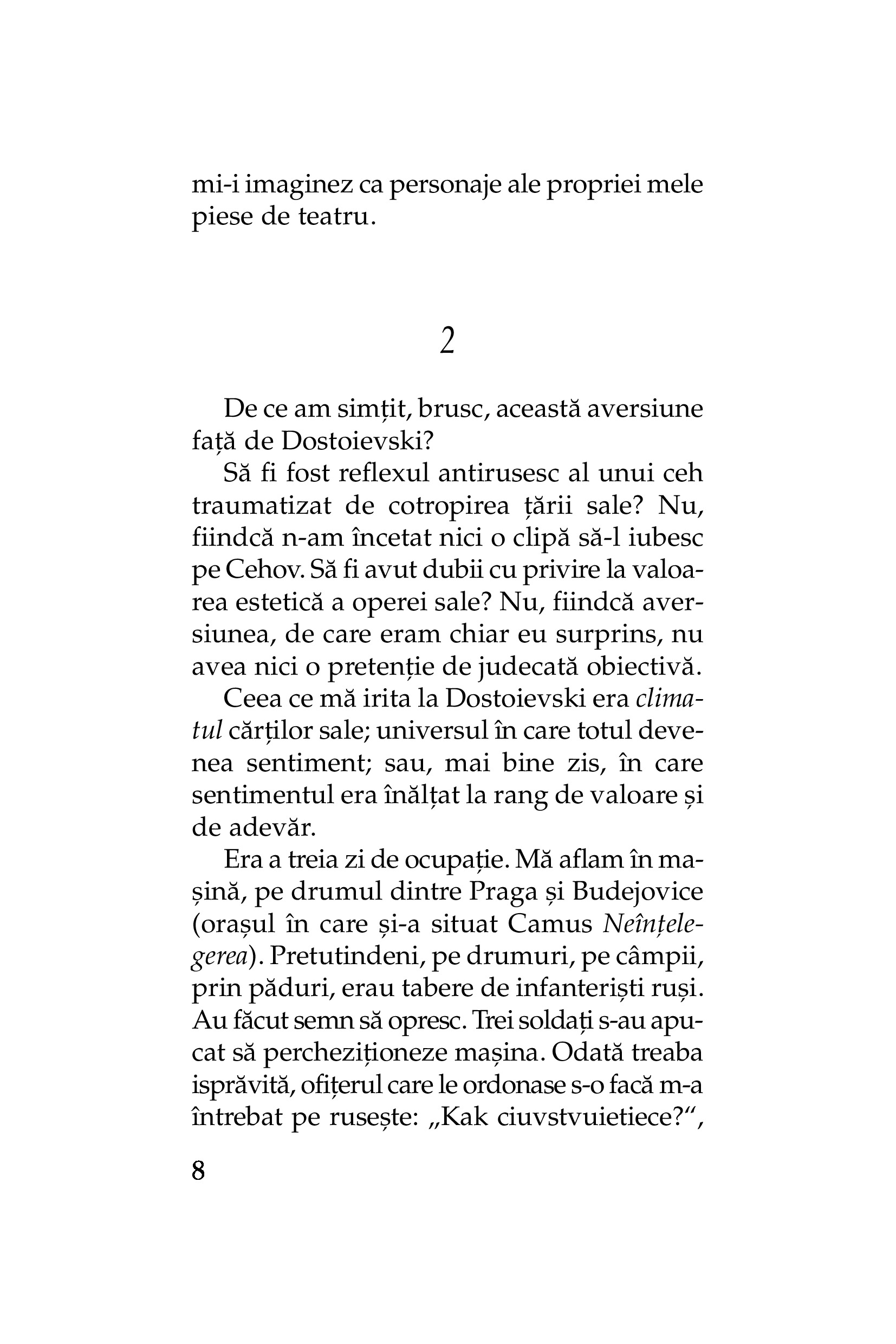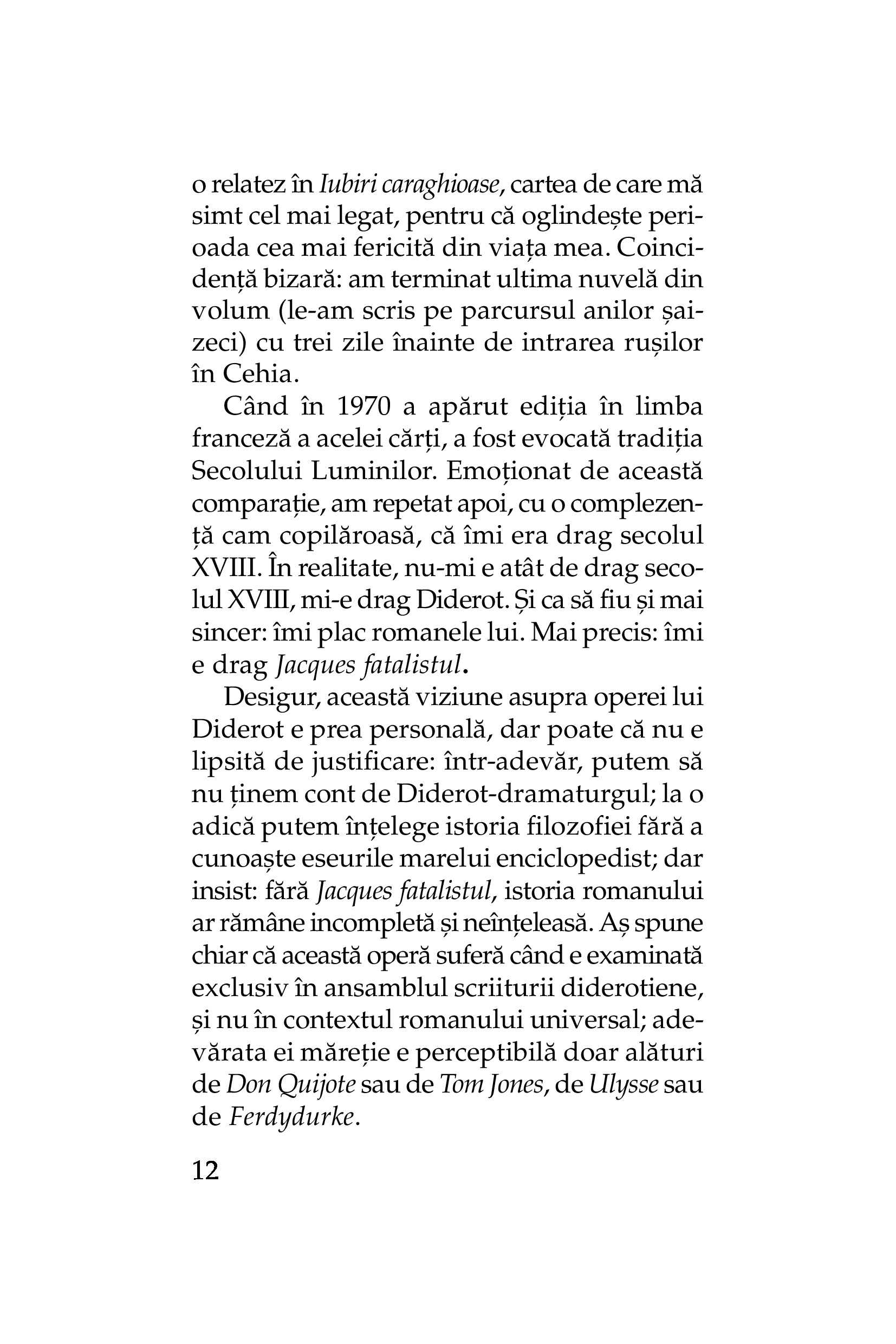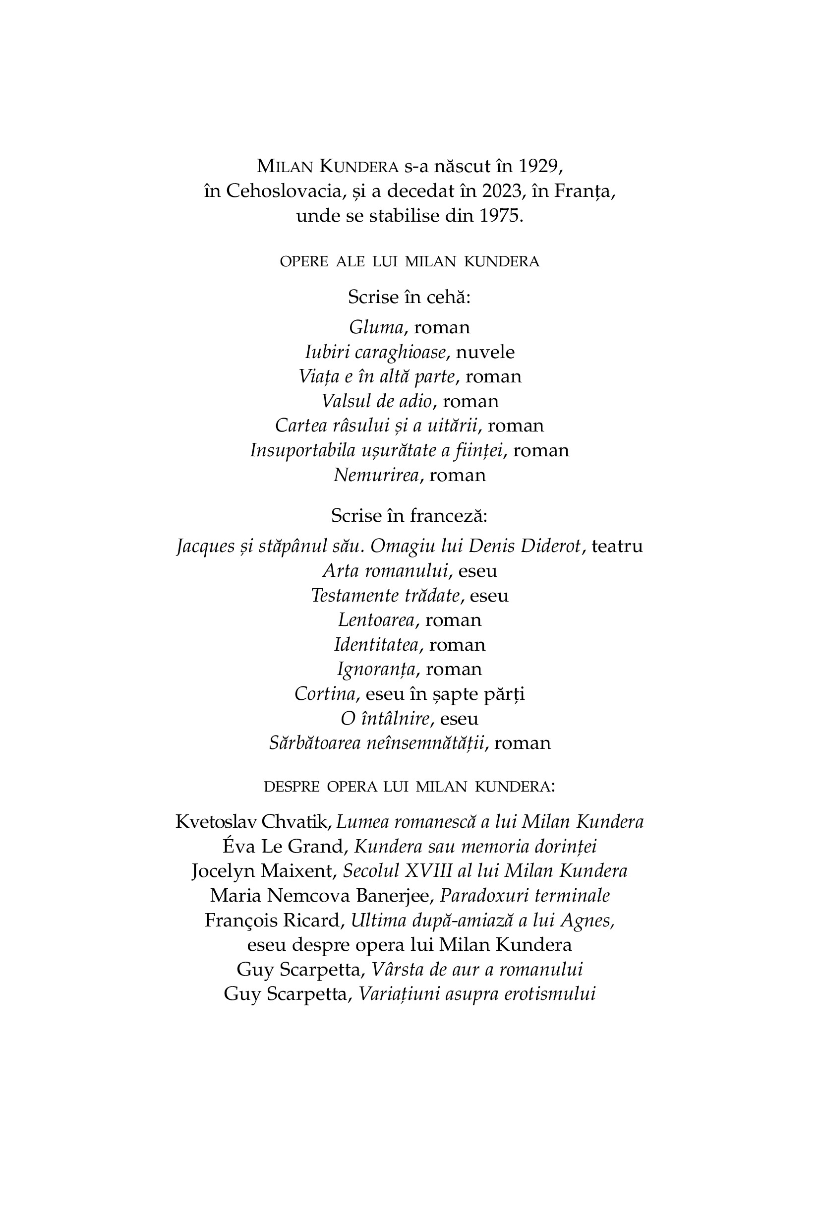 MILAN KUNDERA (1929–2023) Când, în 1968, tancurile sovietice spulberau „Primăvara de la Praga“, era deja un scriitor cunoscut: publicase poezie, teatru, eseuri, iar primul său roman, Gluma, şi nuvelele adunate în volumul Iubiri caraghioase fuseseră tipărite în ultimul an în peste 150 000 de exemplare. Atâta şi ar fi fost de-ajuns pentru ca noile autorităti cehe să-l excludă de la Catedra de literatură universală pe care o ocupa la Academia de Film şi să-i elimine cărţile din toate bibliotecile Cehoslovaciei. Şi cum să fi acceptat un regim împietrit în stalinismul deceniului şase pe acela care fusese nu doar un participant activ la efervescenţa mişcării pragheze, dar mai şi declarase – şi ilustrase în cărţile sale – că tocmai stalinismul l-a învăţat virtutea izbăvitoare a râsului? Iată de ce următorul roman, Viaţa e în altă parte, i-a apărut in 1973 în Franţa, iar doi ani mai târziu autorul însuşi se stabilea aici, devenind în scurt timp un scriitor de faimă internaţională, tradus în toate limbile importante ale lumii.