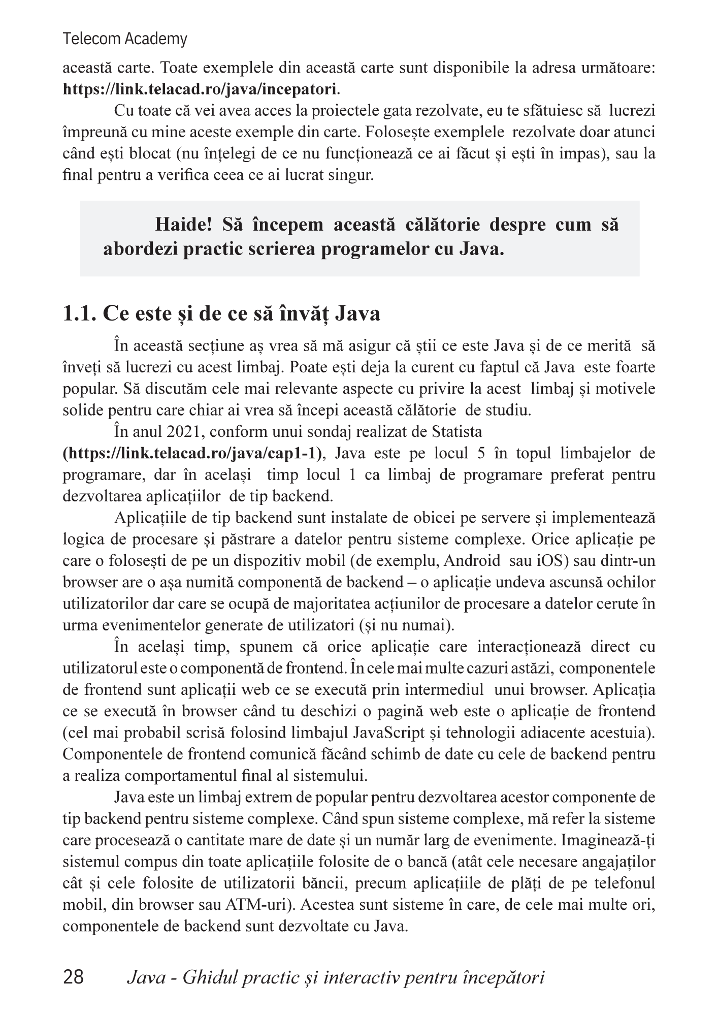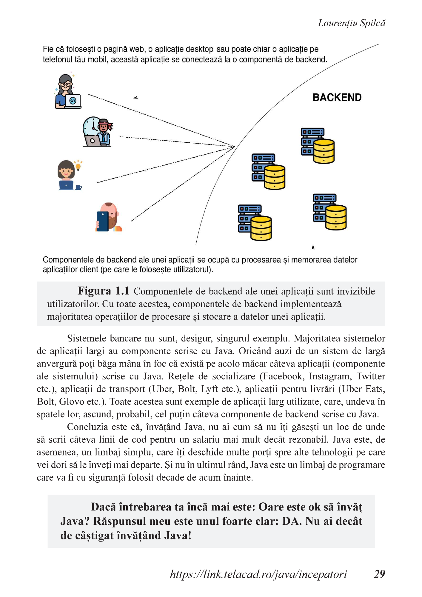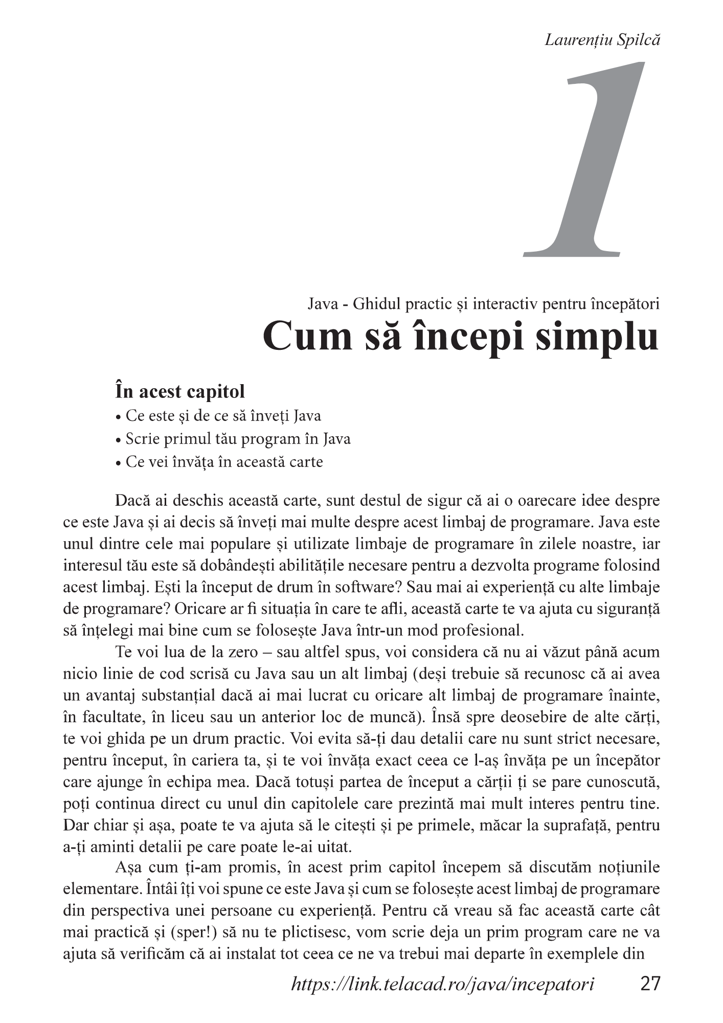 in facultate, in liceu sau un anterior loc de munca). Insa spre deosebire de alte carti, te voi ghida pe un drum practic. Voi evita sa-ti dau detalii care nu sunt strict necesare, pentru inceput, in cariera ta, si te voi invata exact ceea ce l-as invata pe un incepator care ajunge in echipa mea. Daca totusi partea de inceput a cartii ti se pare cunoscuta, poti continua direct cu unul din capitolele care prezinta mai mult interes pentru tine. Dar chiar si asa, poate te va ajuta sa le citesti si pe primele, macar la suprafata, pentru a-ti aminti detalii pe care poate le-ai uitat.” - Laurentiu Spilca