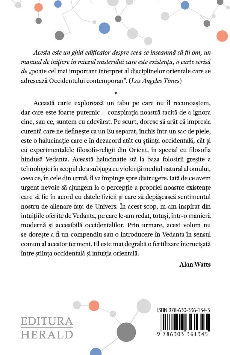 Inspirat de intuitiile oferite de Vedanta, Alan Watts exploreaza in aceasta carte un tabu pe care nu il recunoastem, dar care e foarte puternic: conspiratia noastra tacita de a ignora cine sau ce suntem cu adevarat. El argumenteaza ca perceptia noastra obisnuita, conform careia suntem un „eu” separat, inchis intr-un „sac de piele”, este o halucinatie care contrazice atat stiinta occidentala, cat si experimentalele filosofii-religii din Orient. Aceasta iluzie sta la baza utilizarii gresite a tehnologiei in scopul de a subjuga cu violenta mediul natural al omului, ceea ce, in cele din urma, poate duce la distrugere. Watts subliniaza necesitatea urgenta de a dezvolta o perceptie a propriei existente care sa fie in armonie cu datele fizicii si care sa depaseasca sentimentul nostru de alienare fata de Univers.