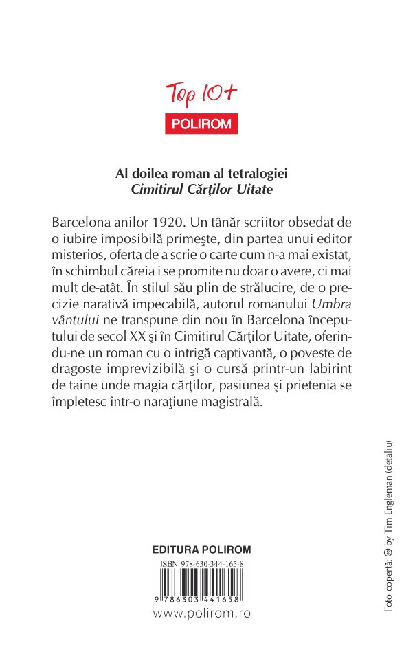 Barcelona anilor 1920. Un tânăr scriitor obsedat de o iubire imposibilă primeşte, din partea unui editor misterios, oferta de a scrie o carte cum n-a mai existat, în schimbul căreia i se promite nu doar o avere, ci mai mult de-atât. În stilul său plin de strălucire, de o precizie narativă impecabilă, autorul romanului Umbra vântului ne transpune din nou în Barcelona începutului de secol XX şi în Cimitirul Cărţilor Uitate, oferindu-ne un roman cu o intrigă captivantă, o poveste de dragoste imprevizibilă şi o cursă printr-un labirint de taine unde magia cărţilor, pasiunea şi prietenia se împletesc într-o naraţiune magistral