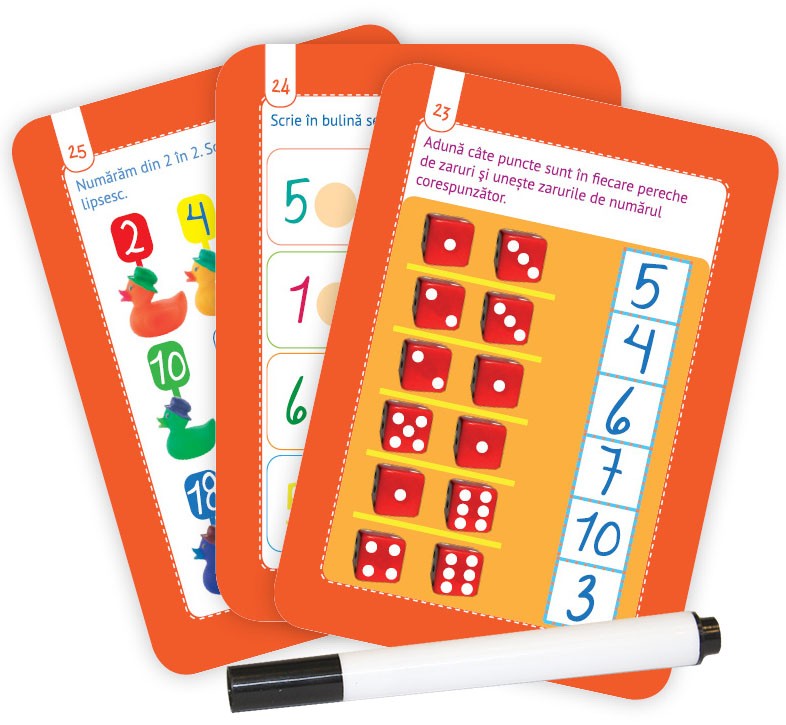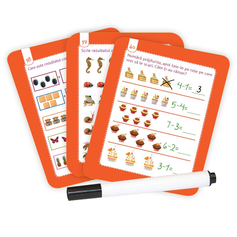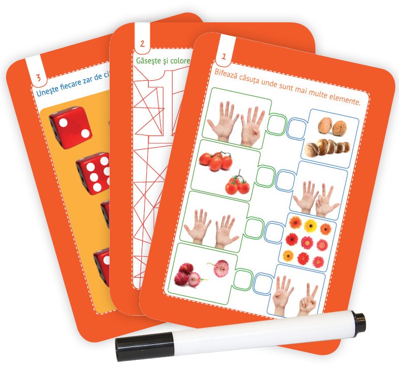 - 40 de fișe plastifiate cu jocuri cu numere până la 30 (fără operații matematice); Cele mai multe activități presupun numărarea elementelor prezente pe fișă și scrierea răspunsului corect, găsirea unor cifre ascunse, construirea unor grupuri de elemente, completarea unor spații cu cifrele potrivite, exerciții de comparare a elementelor etc.