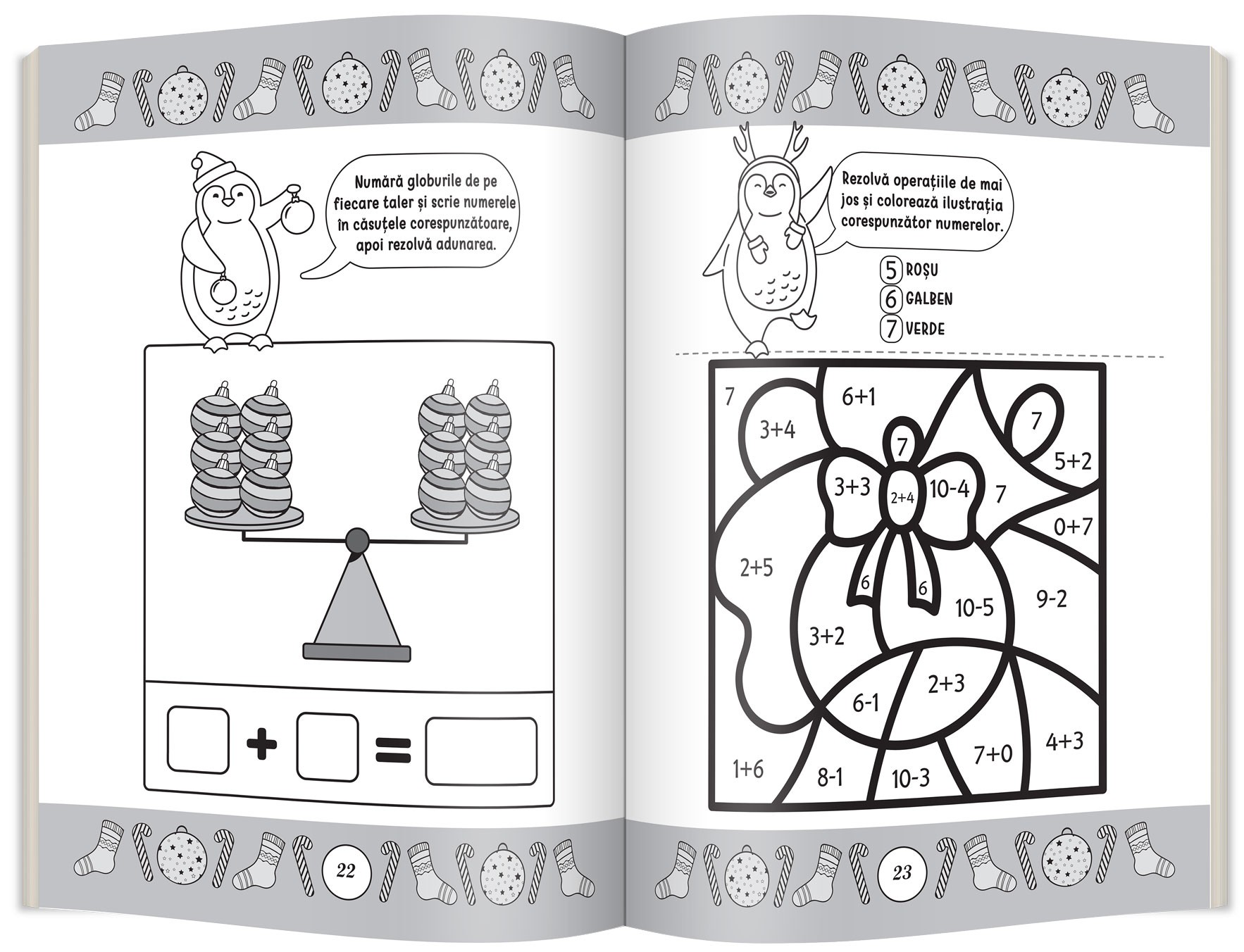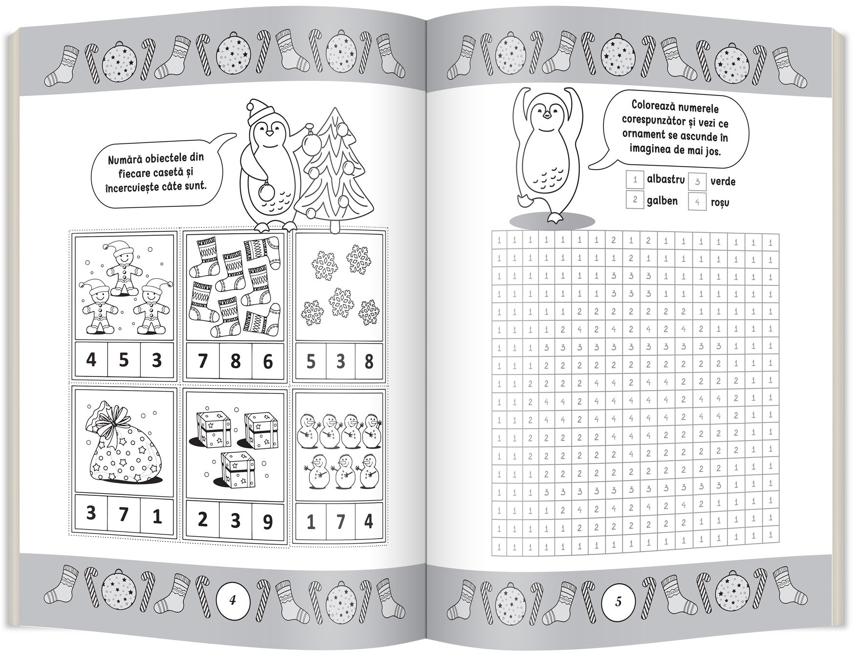 Jocurile matematice cu pinguinii Moșului îl vor introduce într-o lume distractivă cu numere și calcule matematice care îi vor dezvolta logica, concentrarea și atenția, oferindu-i și numeroase pauze de colorat.