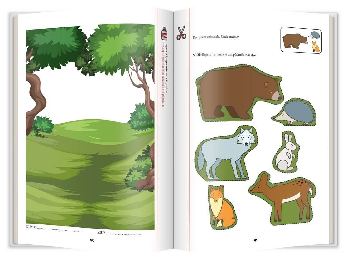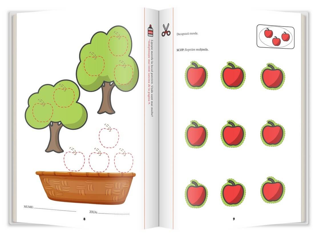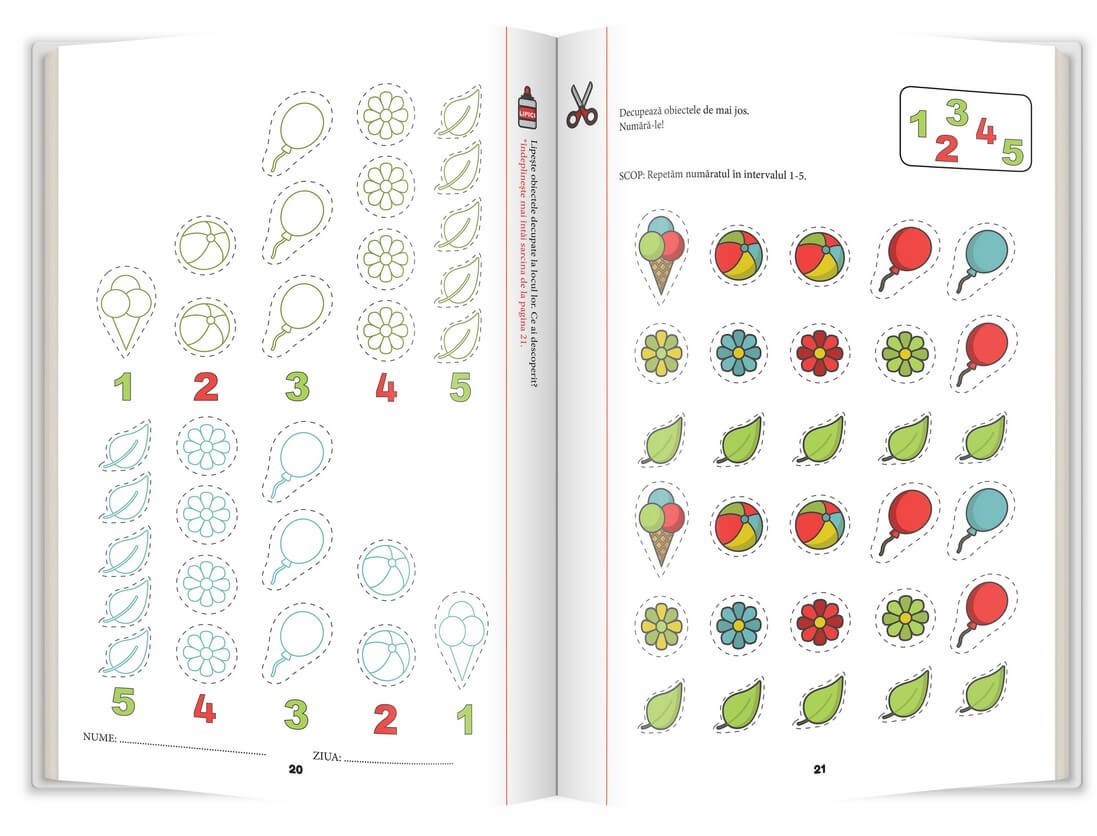 Caietul de activitati practice pentru grupele mica si mijlocie este structurat in doua parti – matematica si cunoasterea mediului – si include sarcini de colorare, decupare si lipire bazate pe recapitularea notiunilor invatate. Fiecare pagina este perforata, pentru a putea fi desprinsa usor din caiet. In timp ce-si exerseaza motricitatea fina, copilul va recapitula: