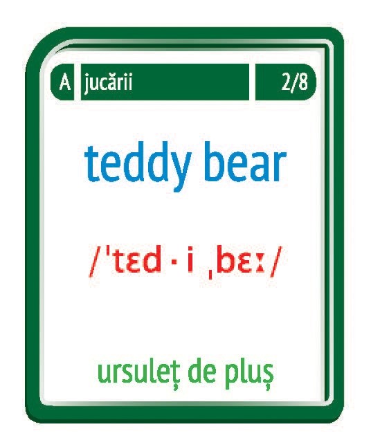 • 56 de carduri cu control al poziției. Fiecare card conține pe o față imaginea, iar pe verso cuvântul din limba engleză corespunzător, însoțit de traducere și transcriere fonetică;