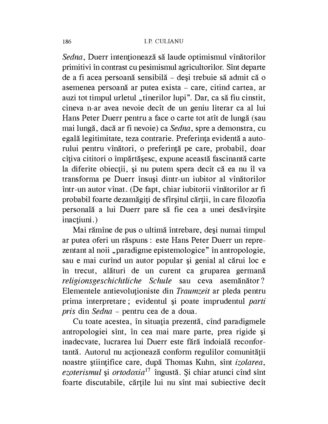 Conjectura mea este că spre sfârșitul vieții sale Culianu a intrat în posesia unui principiu cognitiv care i-a reevaluat într-o manieră radicală toate cunoștințele anterioare și l-a aruncat într-o cursă vertiginoasă de transvaluare a întregii istorii culturale, pe care însă nu a apucat decât să o schițeze. Dacă până în 1985 (dată indicatorie a cezurii) creația lui Culianu este aceea a unui erudit extrem de talentat, distins de colegii săi printr-o înclinație filozofică mai pronunțată, după cezură creația sa capătă un profil nou, deopotrivă straniu și ultimativ. Ceea ce se desprinde din tonul ei este somația descoperirii unui nou temei al unității lumii. Totul la ultimul Culianu devenise urgent și trepidant… -- H.-R. Patapievici