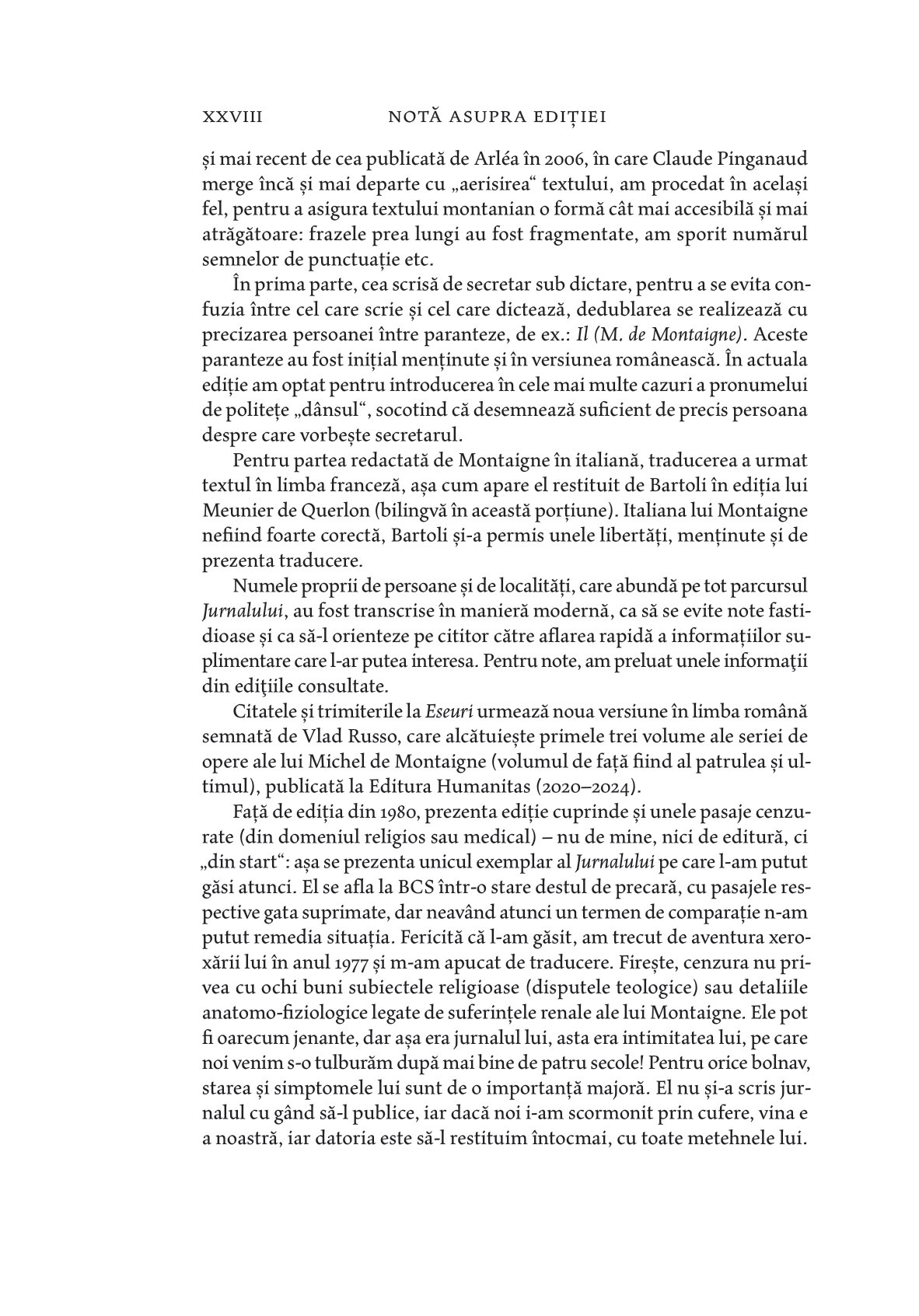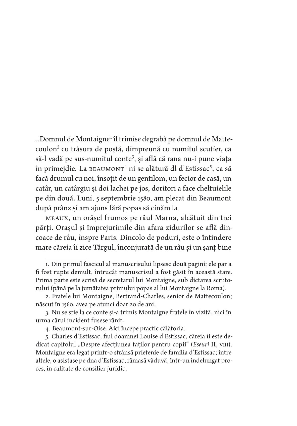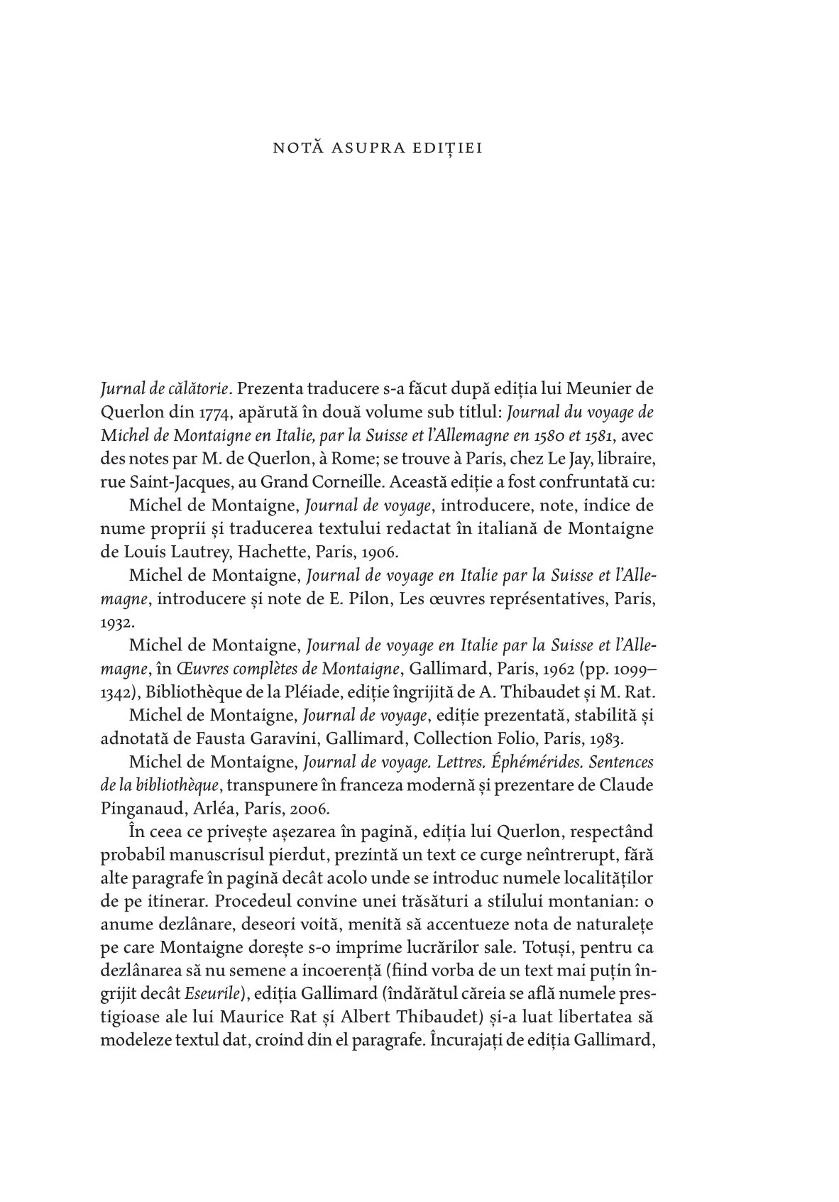 După cele trei cărți ale Eseurilor în tălmăcirea lui Vlad Russo, volumul de față încheie publicarea la Humanitas a operelor lui Michel de Montaigne în traducere românească. El este alcătuit din Jurnalul de călătorie în Italia prin Elveția și Germania (1580–1581), scriere de mare interes pentru cunoașterea lumii europene de la sfârșitul Renașterii, și din cele 38 de scrisori rămase de la Montaigne – printre care cea către tatăl său despre moartea lui Étienne de La Boétie și cea adresată regelui Henric IV, adevărat testament politic al autorului. Este o întregire fericită a portretului pe care Michel de Montaigne și-l face în fiecare pagină a Eseurilor.