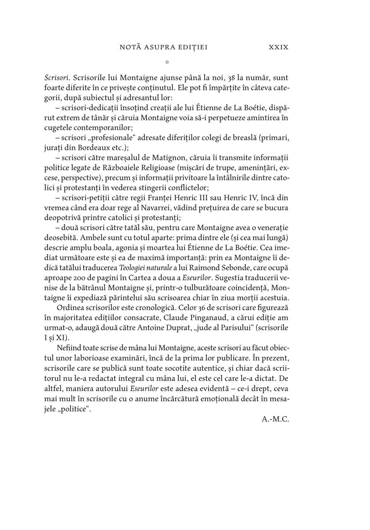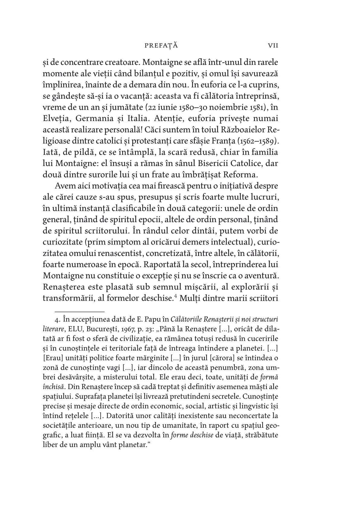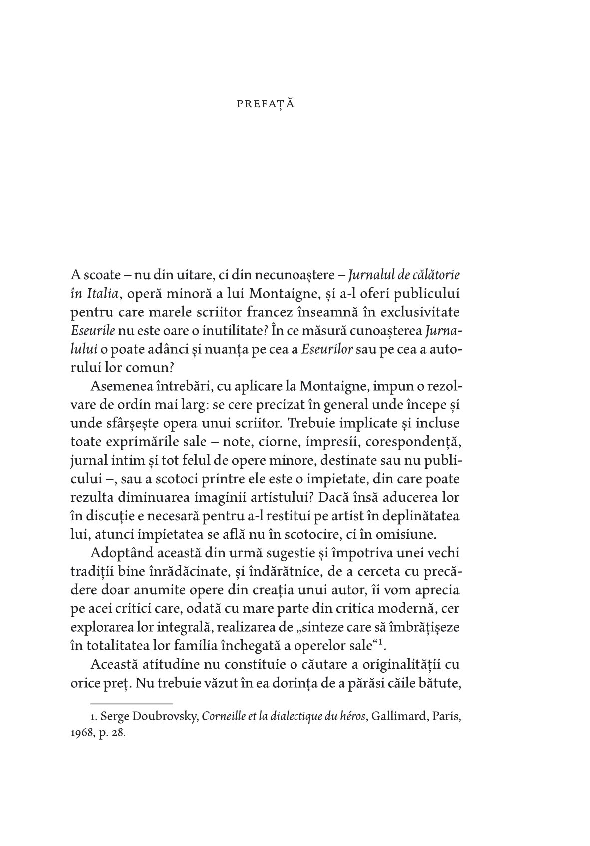 După cele trei cărți ale Eseurilor în tălmăcirea lui Vlad Russo, volumul de față încheie publicarea la Humanitas a operelor lui Michel de Montaigne în traducere românească. El este alcătuit din Jurnalul de călătorie în Italia prin Elveția și Germania (1580–1581), scriere de mare interes pentru cunoașterea lumii europene de la sfârșitul Renașterii, și din cele 38 de scrisori rămase de la Montaigne – printre care cea către tatăl său despre moartea lui Étienne de La Boétie și cea adresată regelui Henric IV, adevărat testament politic al autorului. Este o întregire fericită a portretului pe care Michel de Montaigne și-l face în fiecare pagină a Eseurilor.