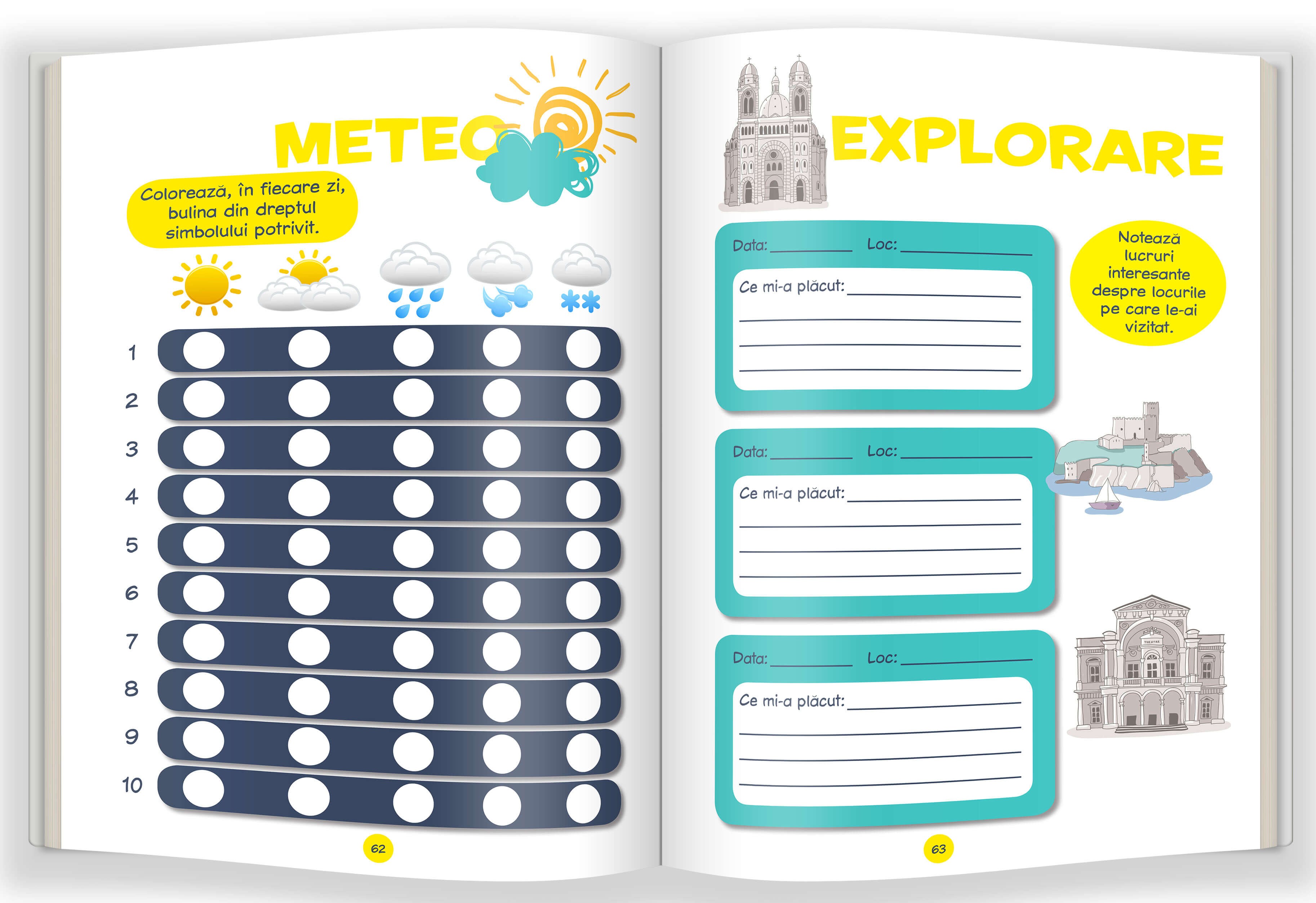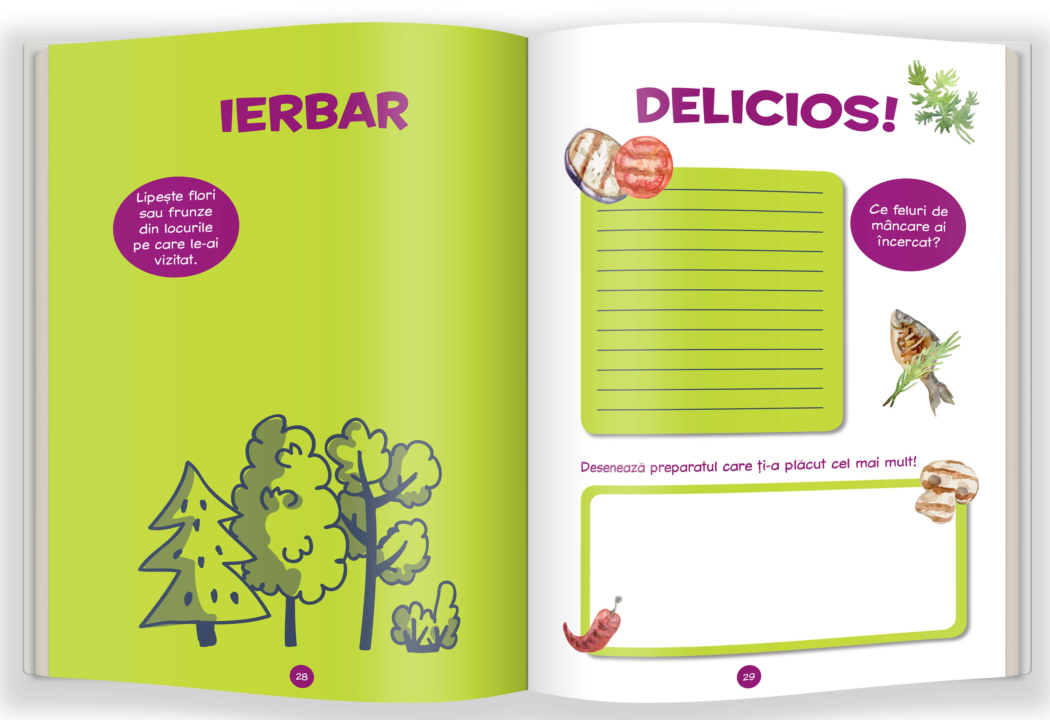 Nu uita să iei cu tine acest jurnal de călătorii, ușor de strecurat în orice rucsac. Te va ajuta să-ți organizezi plecarea, să notezi detalii interesante despre locurile pe care le-ai vizitat și să păstrezi suveniruri. Ai cinci secțiuni separate, pentru cinci călătorii. Iar dacă drumul e lung și plictisitor, la sfârșitul jurnalului găsești pagini cu jocuri amuzante.