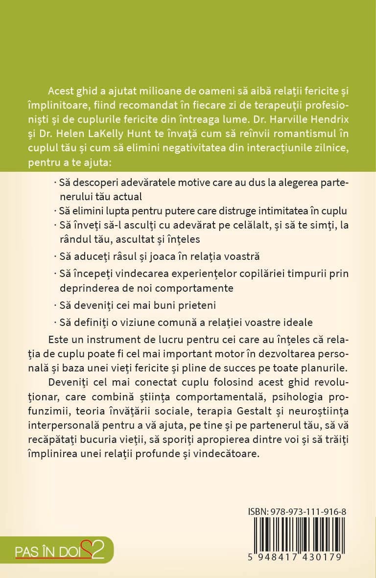 Acest ghid a ajutat milioane de oameni sa aiba relatii fericite si implinitoare, fiind recomandat in fiecare zi de terapeutii profesionisti si de cuplurile fericite din intreaga lume. Dr. Harville Hendrix si Dr. Helen LaKelly Hunt te invata cum sa reinvii romantismul in cuplul tau si cum sa elimini negativitatea din interactiunile zilnice, pentru a te ajuta: