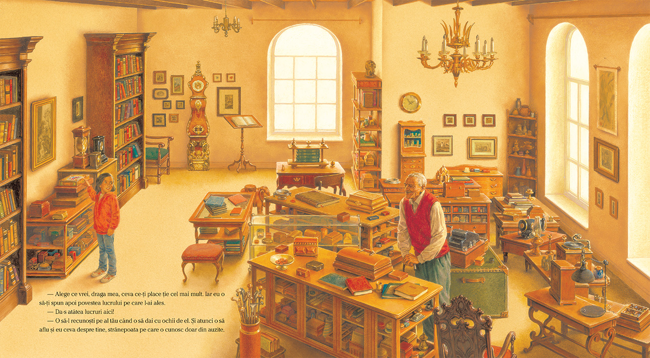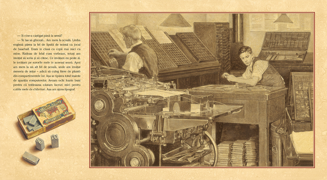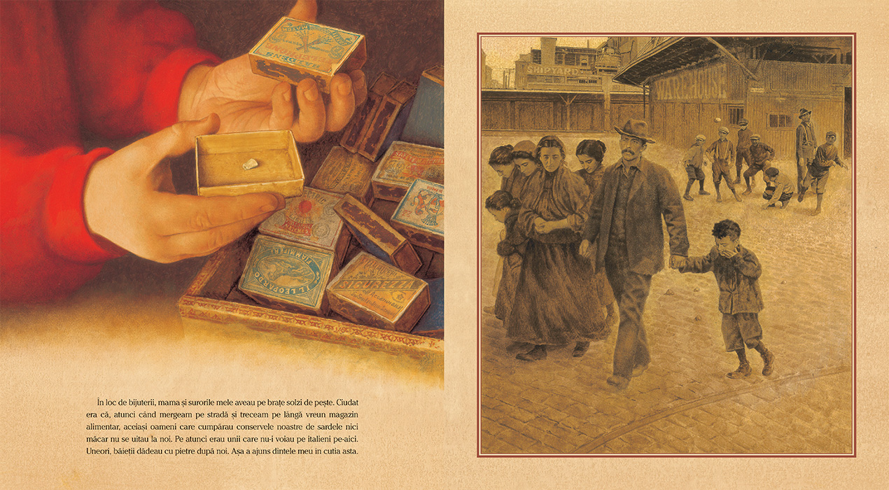 În fiecare cutie se află o amintire și o poveste: un sâmbure de măslină, o agrafă, un bilet la meci, câteva litere de plumb folosite pe vremuri în tipografii și multe alte lucruri pe care străbunicul le-a adunat încă de când era copil pentru a nu-și uita satul sărac din Italia unde s-a născut, călătoria cu familia spre America și anii de greutăți și lipsuri trăiți ca imigrant.