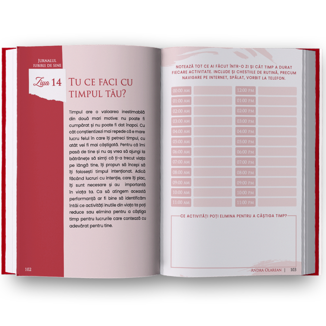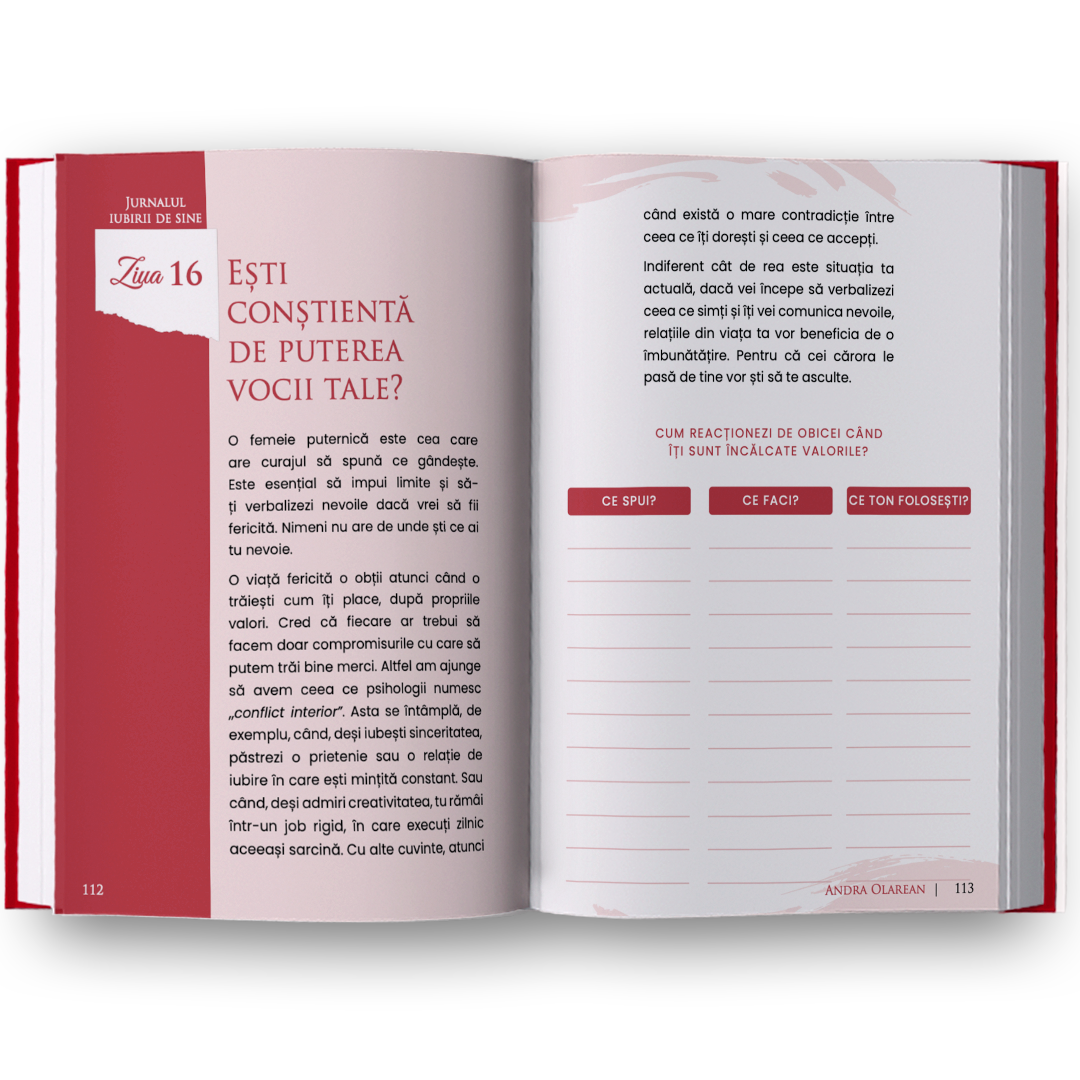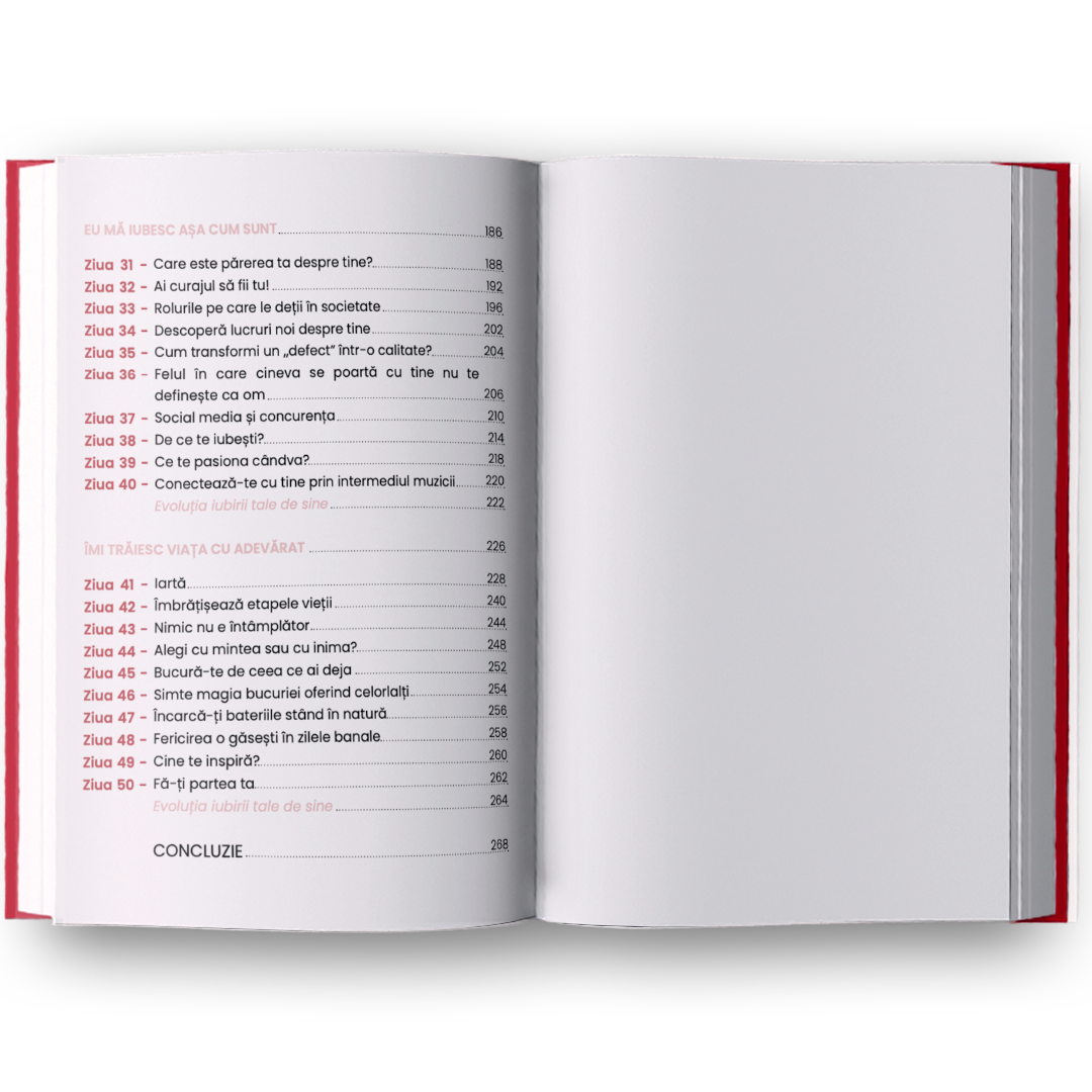 Acest jurnal reprezintă un curs intensiv de vindecare prin care îmi propun să căutăm împreună motivele ce stau în calea fericirii tale, în calea iubirii tale de sine. Se spune că un obicei nou, pentru a putea deveni o rutină, trebuie să îl practici constant minimum 21 de zile consecutive. Tocmai pentru că îmi doresc să te ajut să-ți schimbi viața cu adevărat, te voi îndruma în fiecare zi, pentru o perioadă de 50 de zile oferindu-ți exerciții și teme de reflecție ce te vor ajuta să te ierți și să te iubești din nou, cu adevărat!