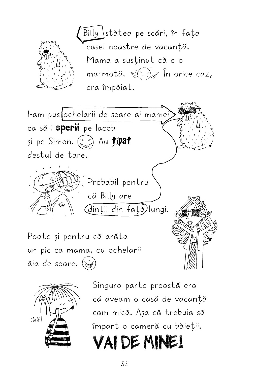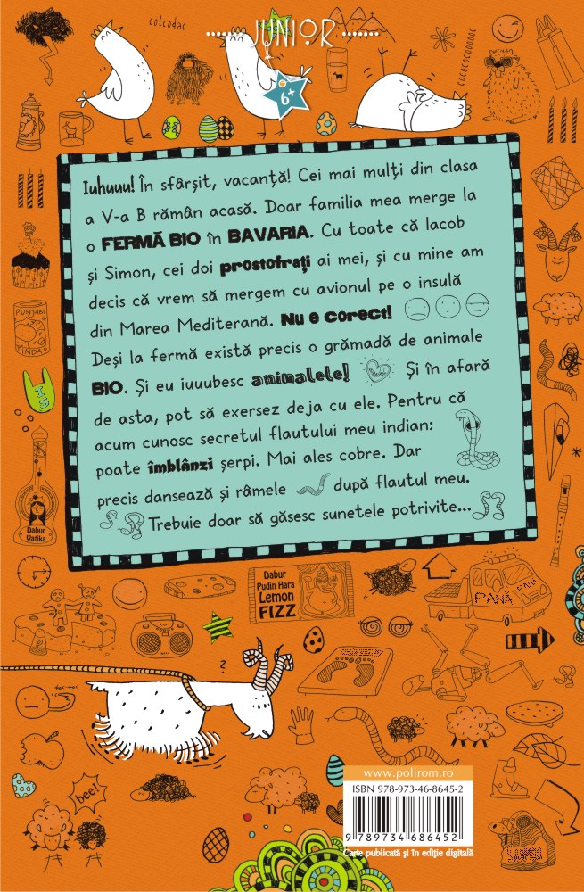 Iuhuuu! În sfârșit, vacanță! Cei mai mulți din clasa a V-a B rămân acasă. Doar familia mea merge la o fermă bio în Bavaria. Cu toate că Iacob și Simon, cei doi prostofrați ai mei, și cu mine am decis că vrem să mergem cu avionul pe o insulă din Marea Mediterană. Nu e corect! Deși la fermă există precis o grămadă de animale bio. Și eu iuuubesc animalele! Și în afară de asta, pot să exersez deja cu ele. Pentru că acum cunosc secretul flautului meu indian: poate îmblânzi șerpi. Mai ales cobre. Dar precis dansează și râmele după flautul meu.