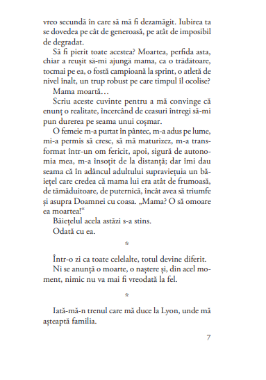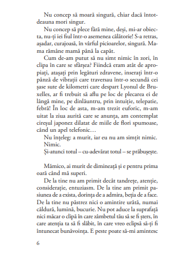 „Un scriitor nu poate reînvia pe nimeni, dar poate da viață prin cuvinte. La doi ani de la dispariția mamei sale, autorul se hotărăște să-și transforme jurnalul doliului în carte – o carte în care nu vorbește de­spre el, ci despre noi, noi toți, care trebuie să înfruntăm, mai devreme sau mai târziu, pierderea părinților. Să dai nume durerii, să trasezi apoi un drum spre lumină, nu e oare acesta cel mai frumos dar pe care un romancier îl poate face cititorilor săi?“ — Le Pèlerin