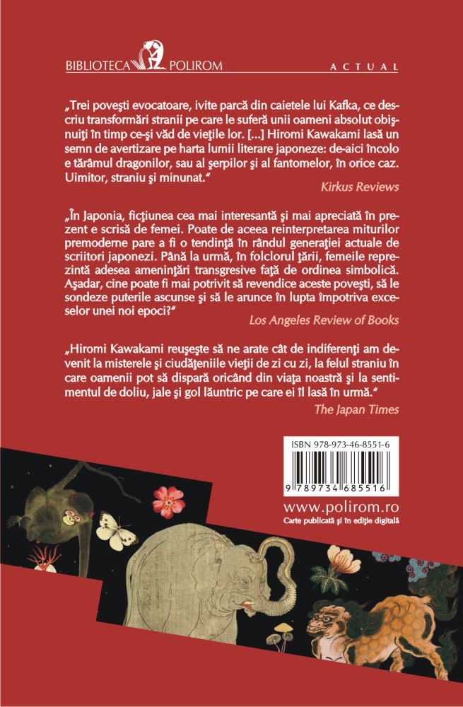 „Trei poveşti evocatoare, ivite parcă din caietele lui Kafka, ce descriu transformări stranii pe care le suferă unii oameni absolut obişnuiţi în timp ce-şi văd de vieţile lor. [...] Hiromi Kawakami lasă un semn de avertizare pe harta lumii literare japoneze: de-aici încolo e tărîmul dragonilor, sau al şerpilor şi al fantomelor, în orice caz. Uimitor, straniu şi minunat.” (Kirkus Reviews)