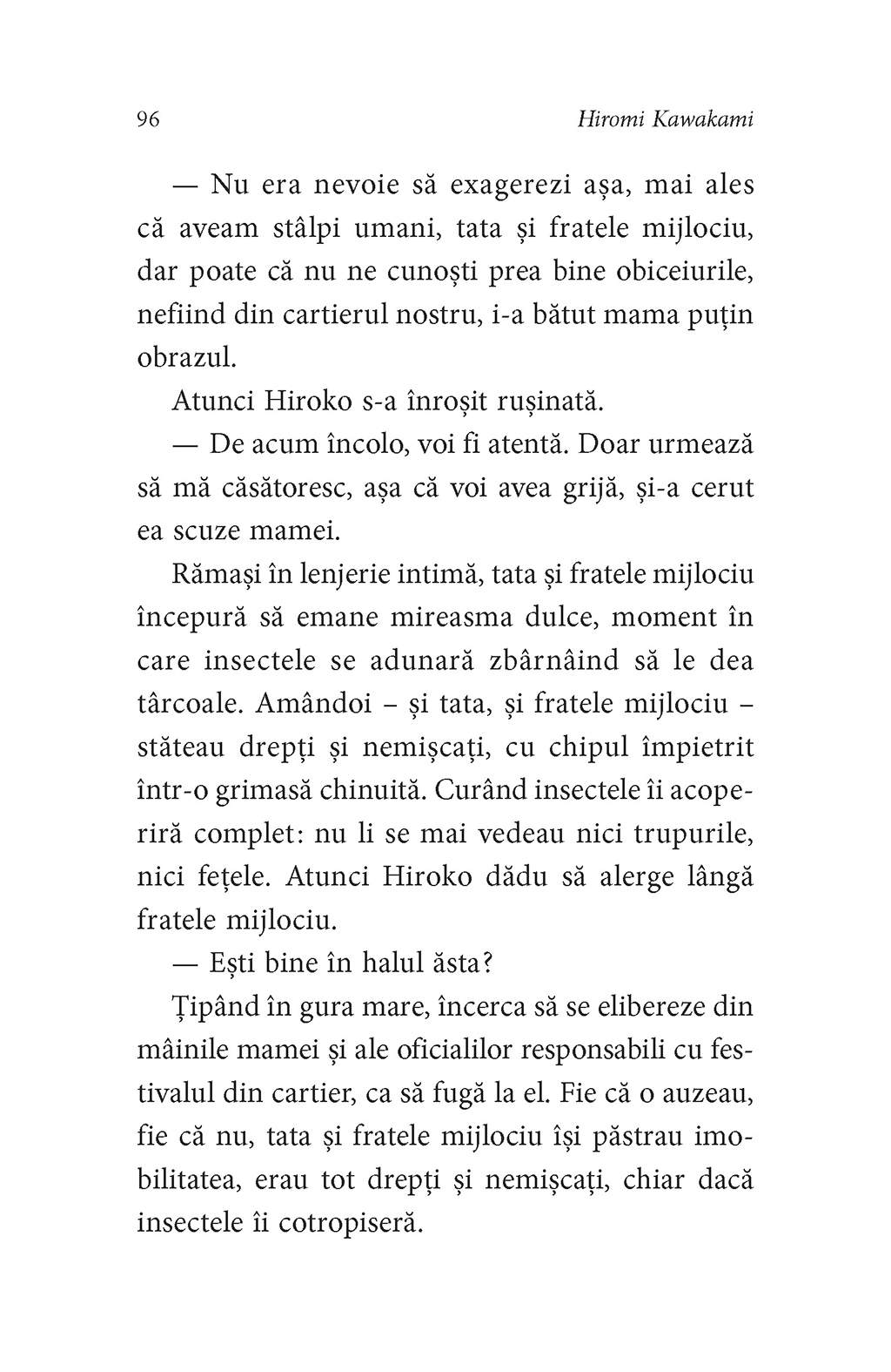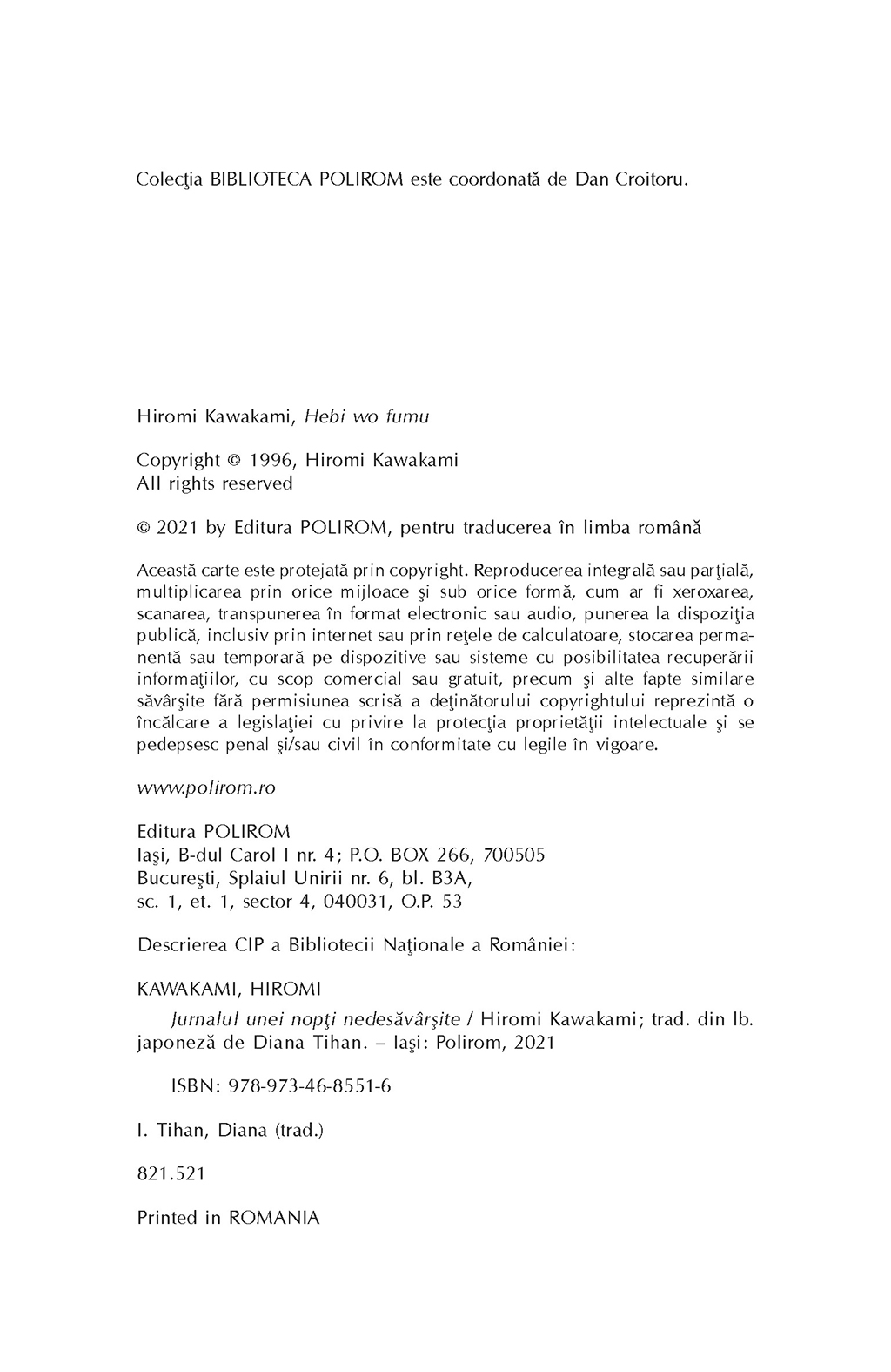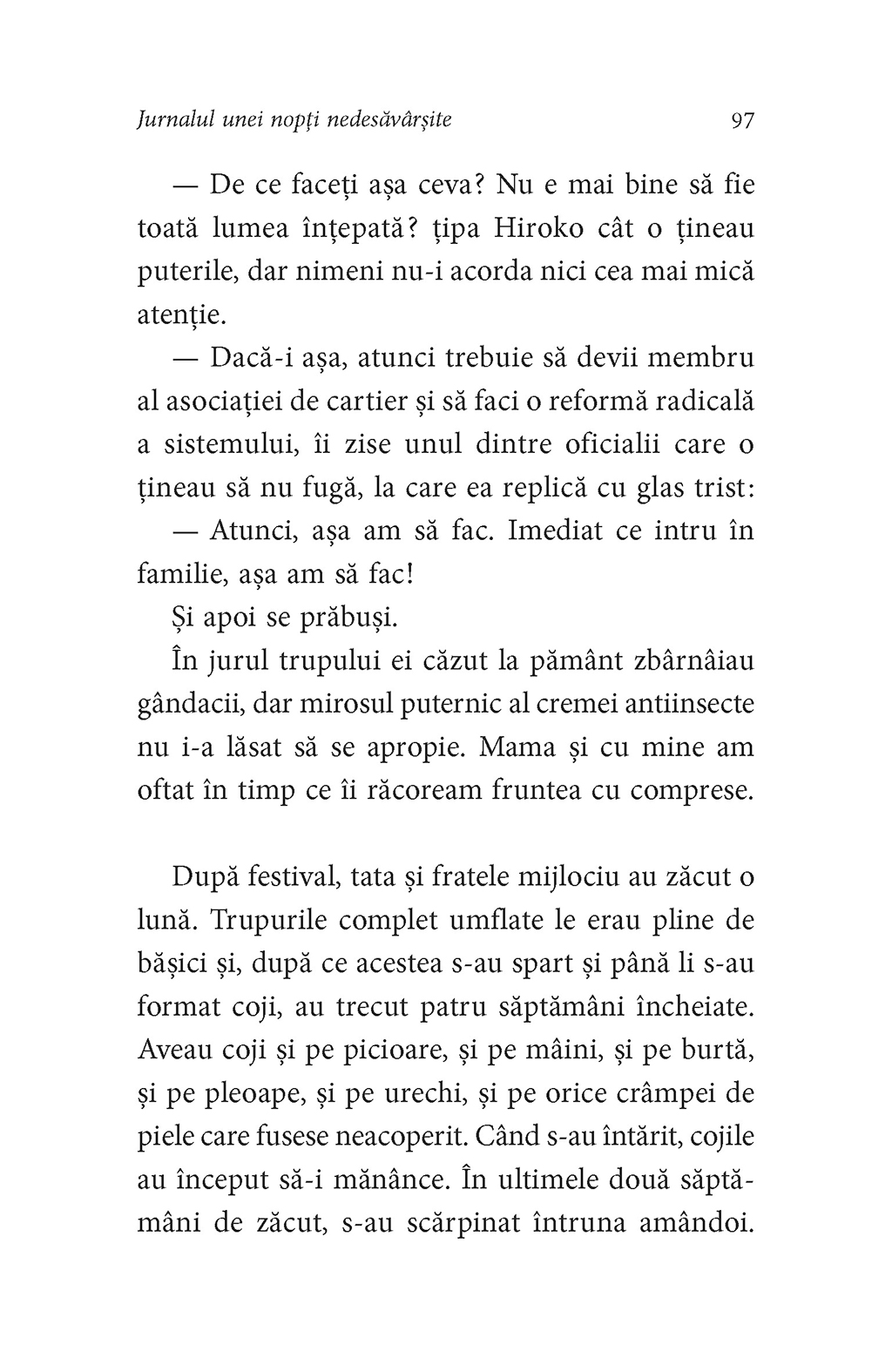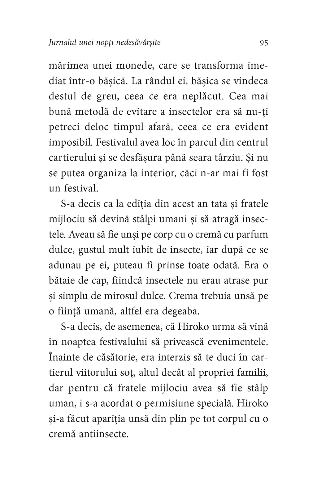 Comparate adesea cu scrierile lui Lewis Carroll, textele lui Hiromi Kawakami prezintă de asemenea influenţe din Gabriel García Márquez şi J.G. Ballard, după cum recunoaşte însăşi prozatoarea, iar Jurnalul unei nopţi nedesăvîrşite nu face excepţie. Veţi descoperi aici trei poveşti care vă vor rămîne în minte şi vă vor bîntui mult timp după ce le-aţi citit. „Sînt mama ta, Hiwako dragă!”, insistă şarpele încolăcit pe stîlp în casa unei femei. Într-o familie ce trebuie să aibă prin lege nici mai mult, nici mai puţin de cinci membri, o fată e singura care-şi poate vedea fratele dispărut. Un personaj straniu fuge în noaptea fără sfîrşit, asaltat de omul-cîrtiţă, de băieţelul care aruncă zvîrlugi şi de păsările kiwi, în vreme ce iubita sa se sfărîmă în mii de bucăţi, înviată şi reînviată necontenit. În universul real se insinuează un altul, un vis în vis, o lume absurdă, cosmogonică, sinuoasă, plină de simboluri care aşteaptă să fie descoperite.