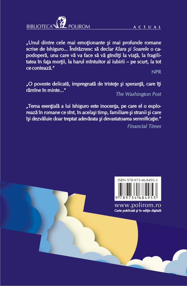 După sfîşietoarea poveste din Să nu mă părăseşti, Kazuo Ishiguro revine cu un roman de aceeaşi factură şi la fel de impresionant, care o are în centru pe Klara, o inteligenţă artificială construită cu scopul de a le ţine companie copiilor şi adolescenţilor. În timp ce aşteaptă în magazin, alături de alţi „prieteni artificiali”, Klara e remarcată de Josie, o fată hotărîtă să şi-o aleagă drept tovarăşă. Doar că Josie pare să sufere de o boală misterioasă şi Klara, un android cu o sensibilitate, o curiozitate şi o imaginaţie neobişnuit de dezvoltate, se simte obligată să o ajute. O umbră apasă permanent asupra lui Josie, iar credincioasa Klara încearcă să o alunge apelînd la puterea mistică a Soarelui. Plasat într-o lume distopică din viitorul apropiat, ale cărei spaime şi obsesii sînt filtrate prin discursul inocent al Klarei, o lume poluată şi alienată, unde copiii învaţă online şi au întîlniri de interacţiune programate de părinţi, Klara şi Soarele este un roman despre iubire şi prietenie, despre sacrificiu şi mîntuire. Perspectiva inedită propusă de Ishiguro prin intermediul personajului central sporeşte impactul acestei poveşti profund umane.