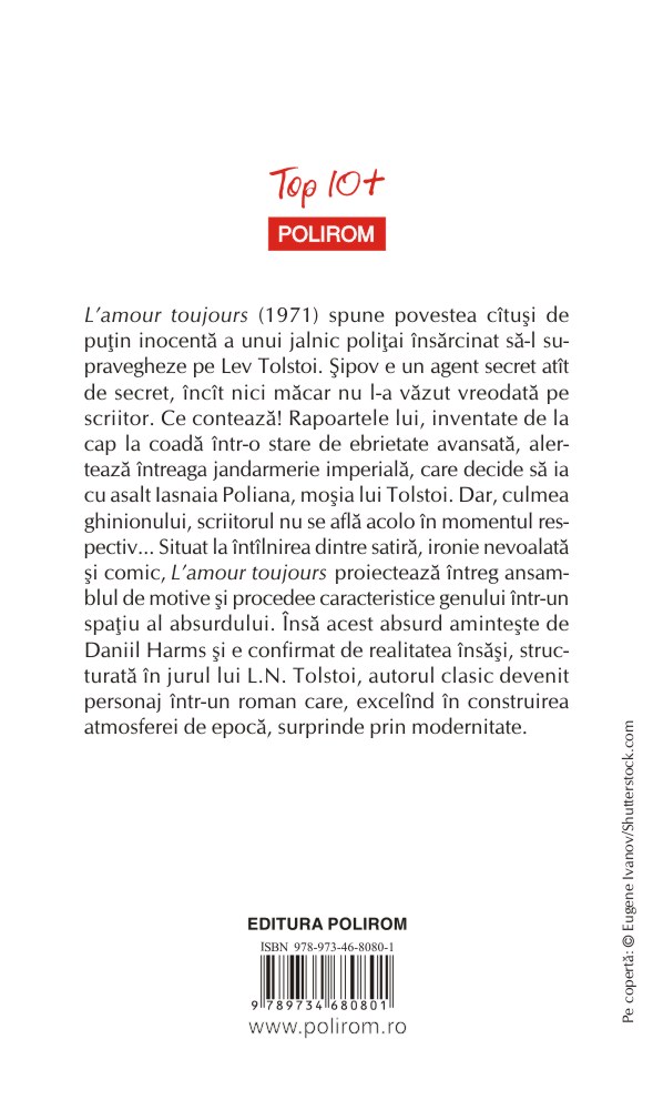 L’amour toujours (1971) spune povestea cîtuşi de puţin inocentă a unui jalnic poliţai însărcinat să-l supravegheze pe Lev Tolstoi. Şipov e un agent secret atît de secret, încît nici măcar nu l-a văzut vreodată pe scriitor. Ce contează! Rapoartele lui, inventate de la cap la coadă într-o stare de ebrietate avansată, alertează întreaga jandarmerie imperială, care decide să ia cu asalt Iasnaia Poliana, moşia lui Tolstoi. Dar, culmea ghinionului, scriitorul nu se află acolo în momentul respectiv... Situat la întîlnirea dintre satiră, ironie nevoalată şi comic, L’amour toujours proiectează întreg ansamblul de motive şi procedee caracteristice genului într-un spaţiu al absurdului. Însă acest absurd aminteşte de Daniil Harms şi e confirmat de realitatea însăşi, structurată în jurul lui L.N. Tolstoi, autorul clasic devenit personaj într-un roman care, excelînd în construirea atmosferei de epocă, surprinde prin modernitate.