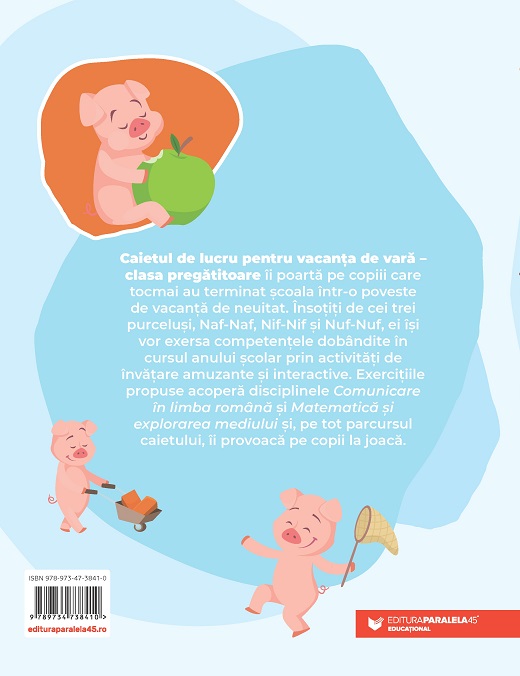 Caietul de lucru pentru vacanța de vară – clasa pregătitoare îi poartă pe copiii care tocmai au terminat școala într-o poveste de vacanță de neuitat. Însoțiți de cei trei purceluși, Naf-Naf, Nif-Nif și Nuf-Nuf, ei își vor exersa competențele dobândite în cursul anului școlar prin activități de învățare amuzante și interactive. Exercițiile propuse acoperă disciplinele Comunicare în limba română și Matematică și explorarea mediului și, pe tot parcursul caietului, îi provoacă pe copii la joacă.