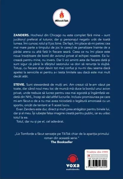 ZANDERS. Hocheiul din Chicago nu este complet fără mine – sunt jucătorul preferat al tuturor, dar și personajul negativ urât de toată lumea. Îmi cunosc rolul și îl joc bine. De fapt, îmi place să-mi petrec cea mai mare parte a timpului de joc în careul de penalizare înainte de a părăsi arena cu altă fată în fiecare seară. Ceea ce nu îmi place este noua însoțitoare de bord din avionul privat al echipei noastre. Ea lucrează pentru mine, nu invers. Dar îi voi aminti asta de fiecare dată și sunt sigur că până la sfârșitul sezonului va dori să renunțe la slujbă. Totuși, cu fiecare zbor devin tot mai confuz și nu-mi dau seama dacă apelez la serviciile ei pentru a-i testa limitele sau dacă este mai mult decât atât.
