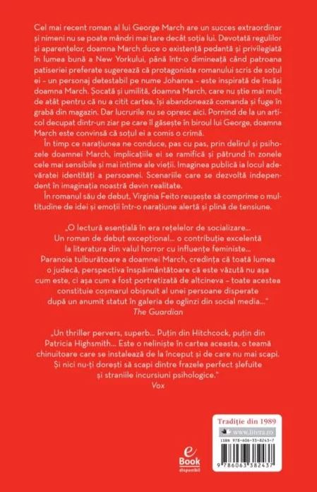 Cel mai recent roman al lui George March are un succes extraordinar și nimeni nu se poate mândri mai tare decât soția lui. Devotată regulilor și aparențelor, doamna March duce o existență pedantă și privilegiată în lumea bună a New Yorkului, până într-o dimineață când patroana patiseriei preferate sugerează că protagonista romanului scris de soțul ei – un personaj detestabil pe nume Johanna – este inspirată de însăși doamna March. Șocată și umilită, doamna March, care nu știe mai mult de atât pentru că nu a citit cartea, își abandonează comanda și fuge în grabă din magazin. Dar lucrurile nu se opresc aici. Pornind de la un articol decupat dintr-un ziar pe care îl găsește în biroul lui George, doamna March este convinsă că soțul ei a comis o crimă.