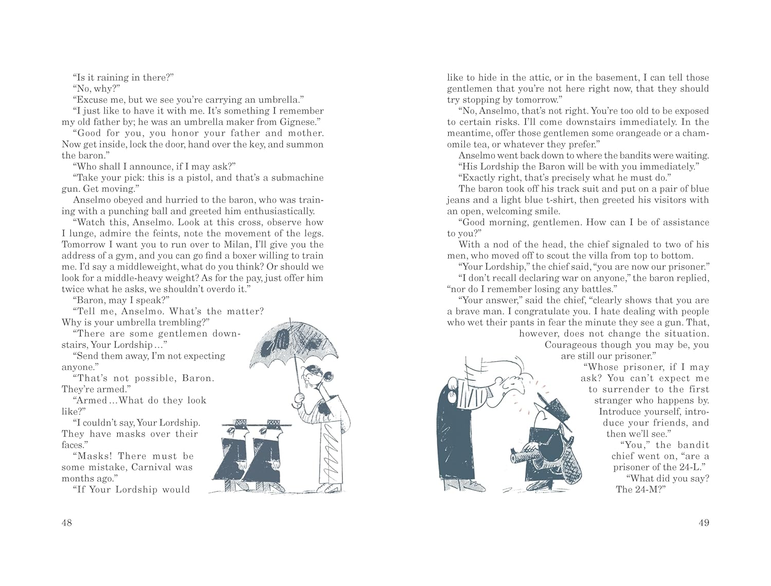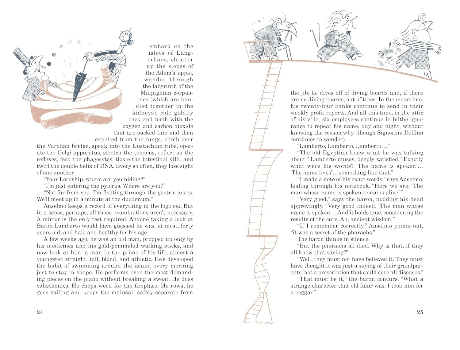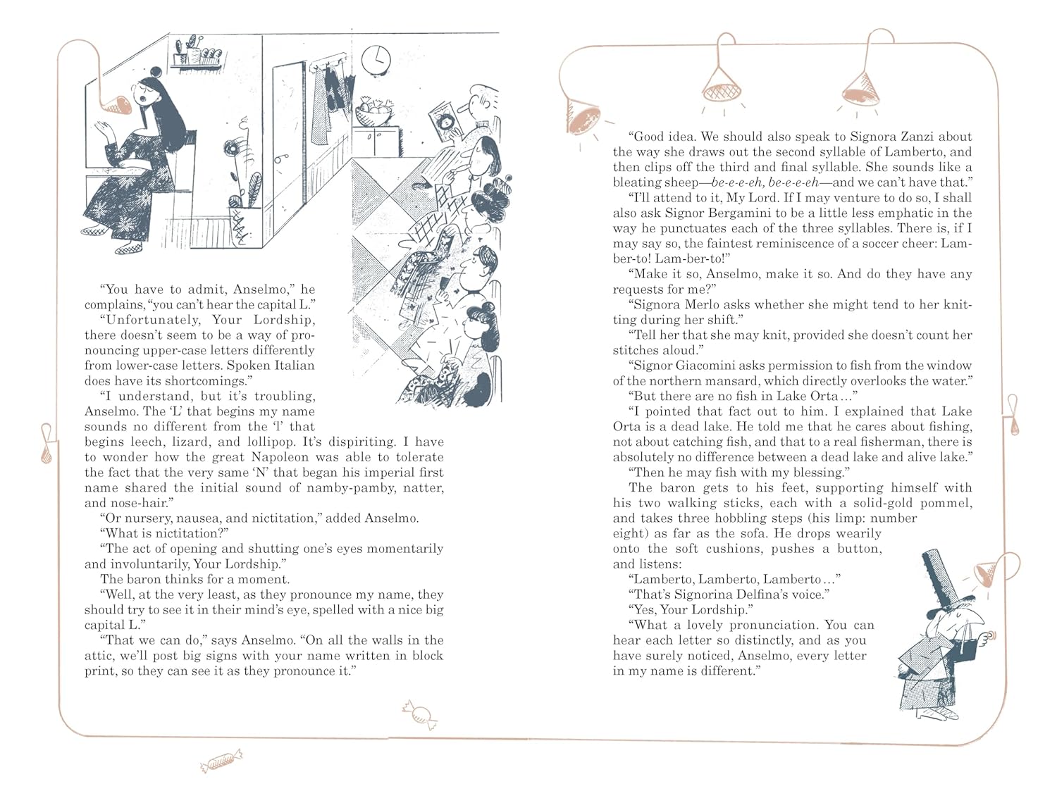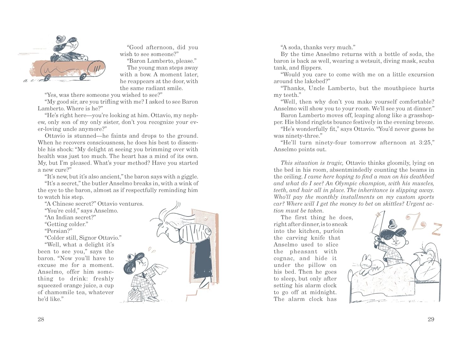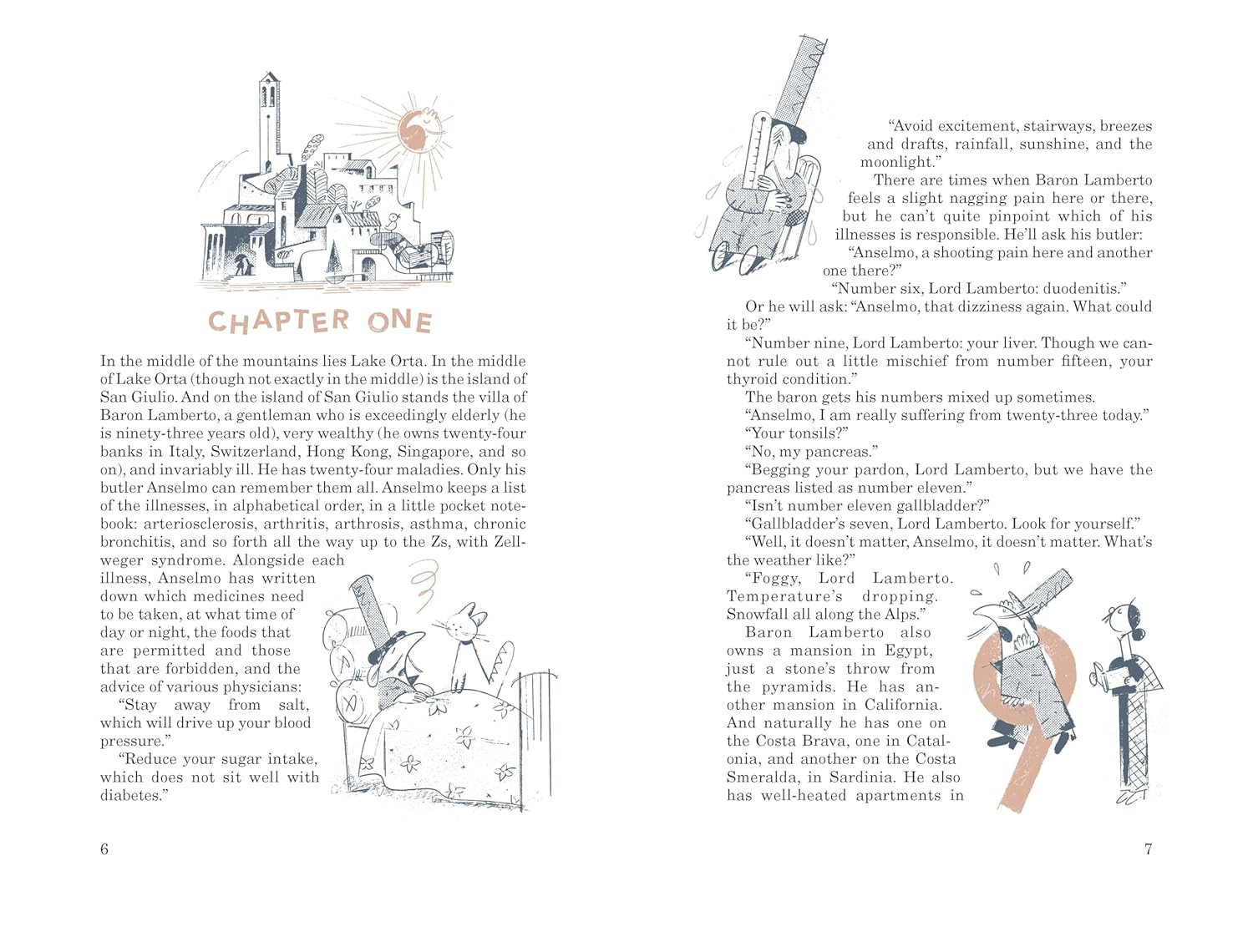 Baron Lamberto is very old, very rich, and very sick. He lives in a villa on a private island in the middle of Lake Orta, tended to by his trusty butler, Anselmo, who keeps track of the baron’s 24 maladies, 24 banks, and endless eccentricities.