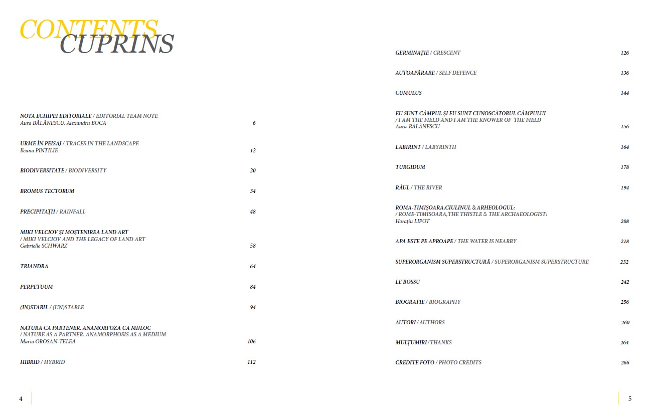 The land art works created and documented by Miki Velciov no longer exist; many were ephemeral interventions in sites that nature has reclaimed or interventions that have been installed, documented, and dismantled. This catalogue thus becomes a unique testimony to a series of lost artistic creations, positioning itself as an important editorial debut for the artist, who thus wishes to contribute to the national art scene. In this context, an art book with images and explanations directly from the artist and critical texts from theorists can mediate the relationship between the public and an unknown but potentially visible and informative artistic niche. The catalogue proposes Miki Velciov as a representative of the land art movement in Europe, but also maps the specific natural spaces of the wild areas in which the artist has created through approachable and consistent content for the public to understand the process and challenges of the act of creating artistic interventions in nature, as well as raising questions about human influence on the natural environment.