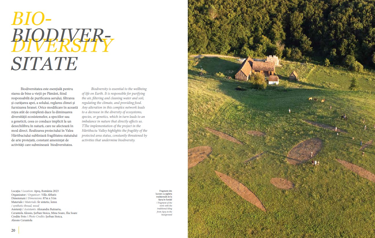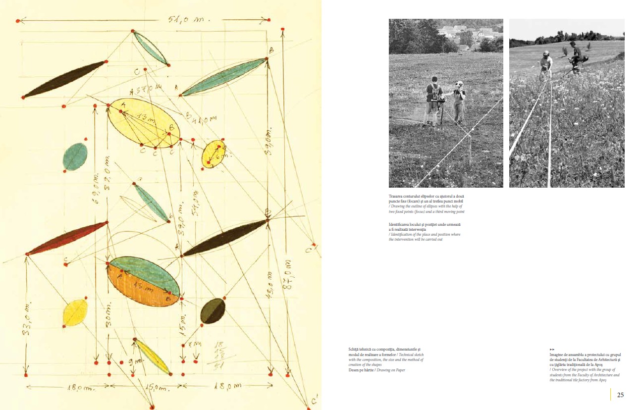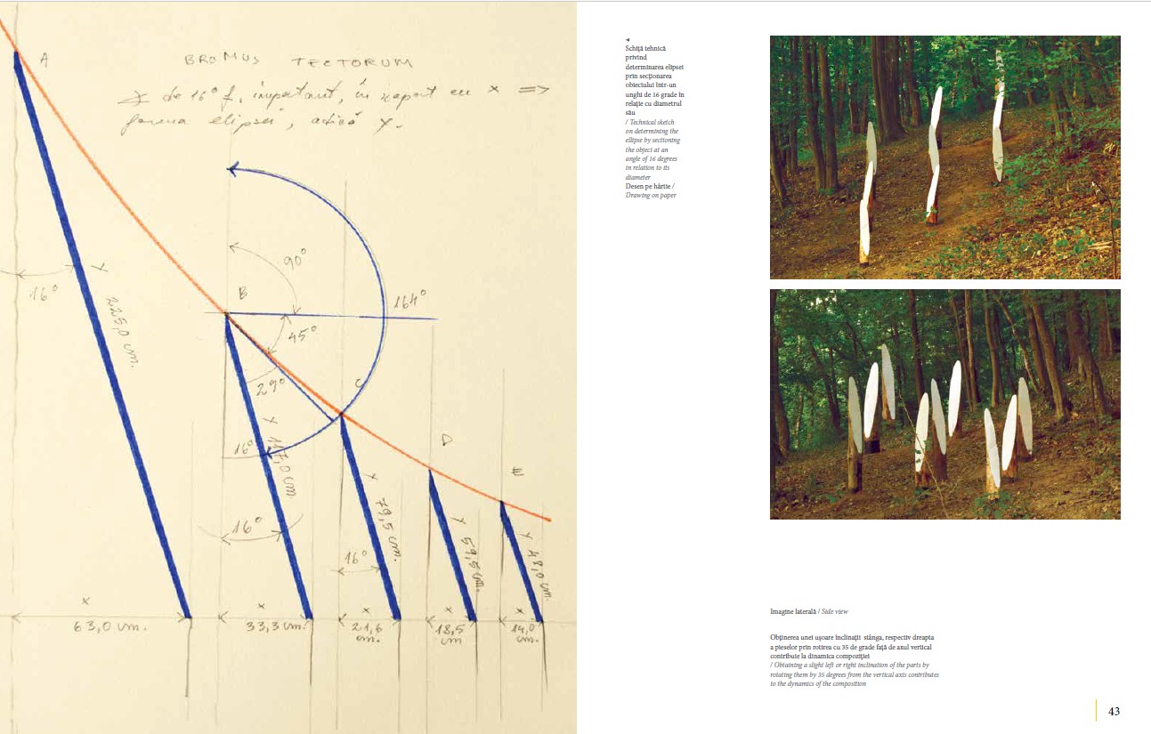 It also presents the technical arsenal used by Velciov to realise his monumental anamorphic installations that involve viewers in optical illusions extended to the scale of the landscape, referring to vanishing points arising from the pyramids of visual perspective. Guest authors such as Ileana Pintilie complement the documentation with critical studies, referring to the role of the land art artist in bringing ecological issues to light. Gabrielle Schwarz emphasises the tendency of land art experiments to transform the classical theme of the landscape into a “flux, due to both our own movements through space and the changing conditions around us.” Maria Orosan Telea talks about the history of the anamorphosis abscondita approaches, specific to the Italian Baroque to “ create harmonious, balanced ensembles or achieve optical effects of lengthening distances and equalising elements, which, in fact, have different dimensions.” Horațiu Lipot asks us a rhetorical question: “What would an archaeologist from superrational future think of these true codexes by Miki Velciov?” Aura Bălănescu emphasises the “observational situations” specific to Velciov’s compositions, which place the viewer in the context of the coexistence of contradictory states.