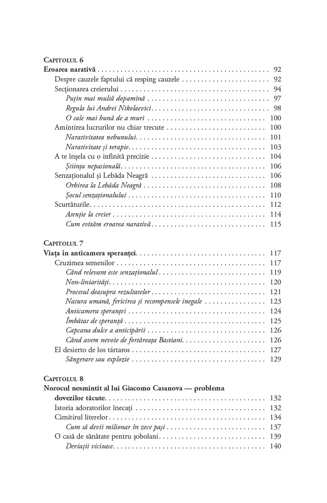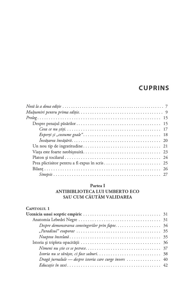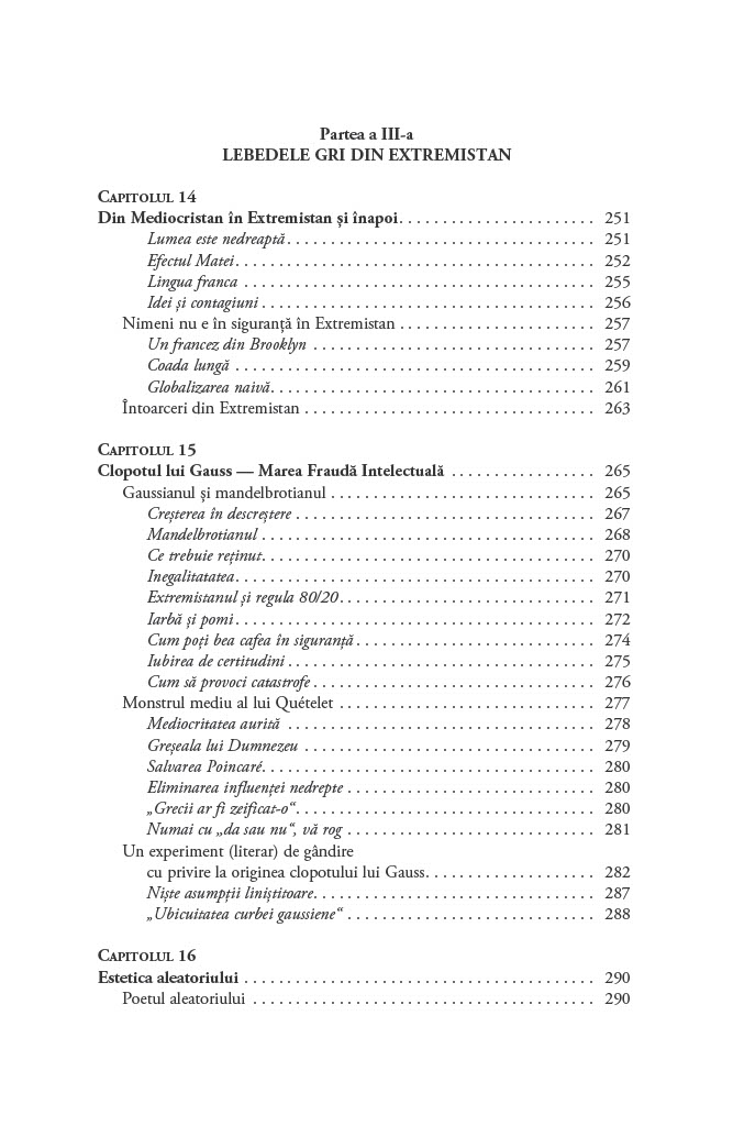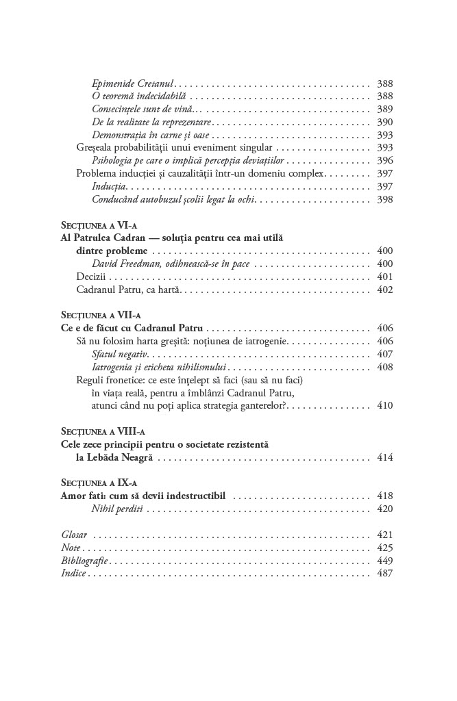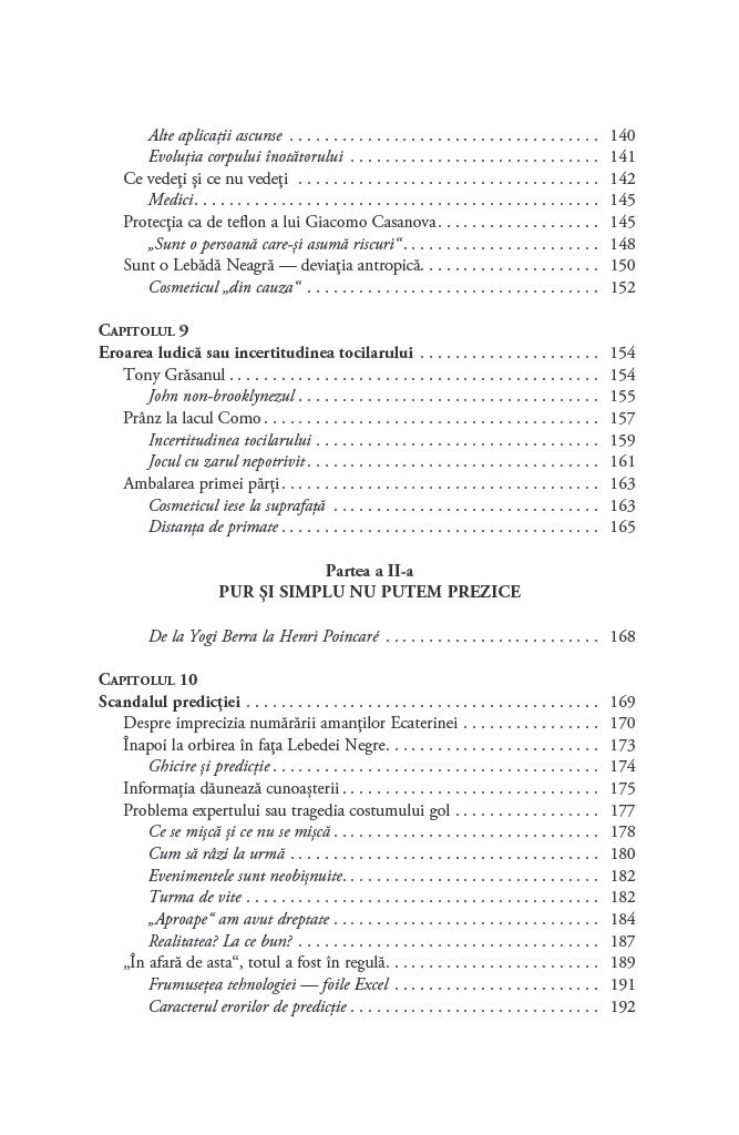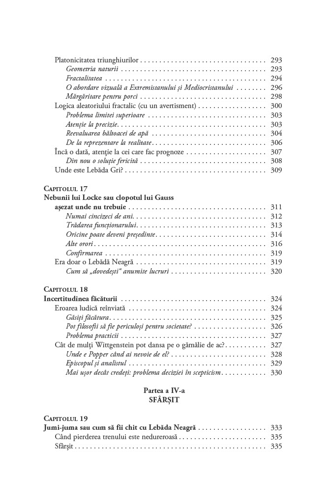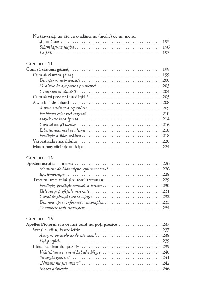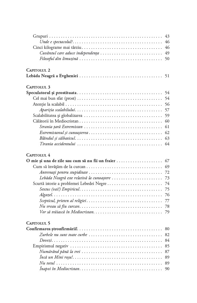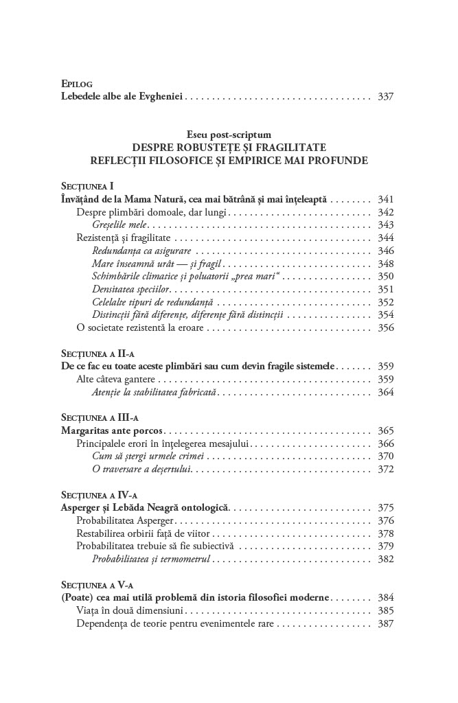 Cum luăm decizii în condiții de incertitudine? De ce ne concentrăm asupra lucrurilor pe care le cunoaștem și ignorăm evenimentele improbabile, dar reale, cum ar fi existența lebedelor negre, care ar putea să ne schimbe perspectiva asupra oportunităților de care dispunem?Până să descopere Australia, Lumea Veche nu s-a îndoit vreodată că toate lebedele sunt albe. O singură pasăre neagră a zdruncinat convingerea milenară și a demonstrat fragilitatea cunoașterii empirice. Astfel, lebăda neagră a devenit exemplul sugestiv pentru un eveniment foarte puțin probabil. Acest tip de eveniment are trei însușiri principale: raritatea, impactul extrem și invocarea unor explicații ulterioare elocvente de tip cauză–efect.Lebedele negre sunt ascunse vederii, obturate de o multitudine de teorii iraționale și prejudecăți. În plus, sunt inconsecvente și dificil de prezis. Cu toate acestea, au avut un rol decisiv în modelarea tehnologiei, științei, afacerilor și culturii. După ce ne demonstrează că evenimentele neașteptate sunt o parte importantă a vieții noastre, Taleb ne învață cum să beneficiem de pe urma lor și ne arată cum să devenim experți în a prevedea imprevizibilul.