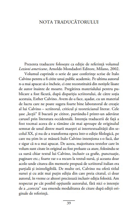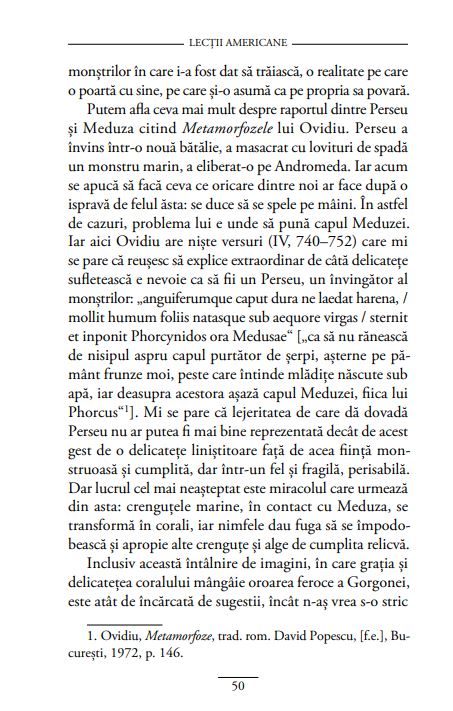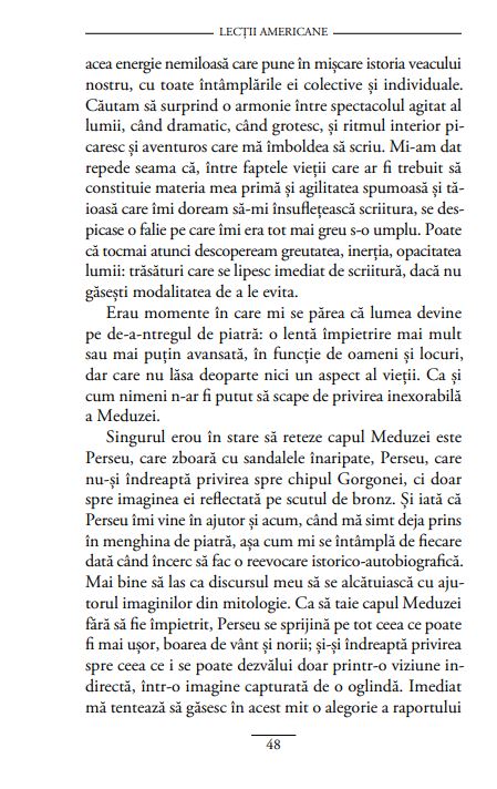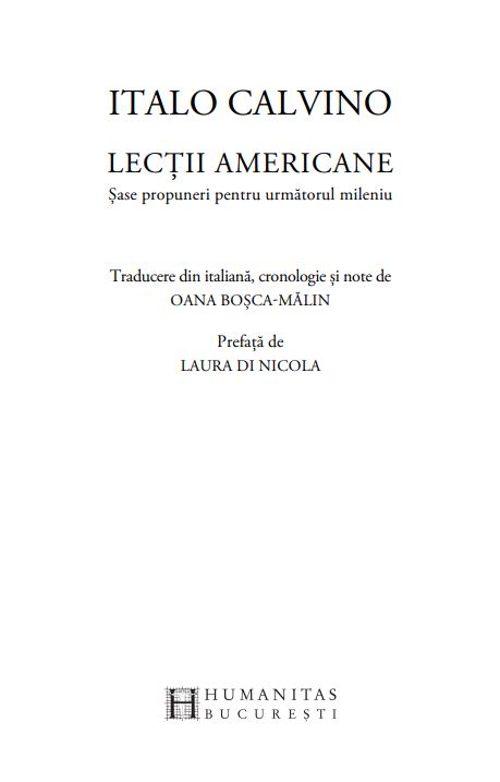 Lecţiile americane readuc la suprafaţă, după o lungă sedimentare în memoria unui cititor-scriitor, un intens, pasionat, constant dialog cu propriii clasici, necesari, de neînlocuit în existenţa omenească. Printre clasicii cu care dialoghează Calvino, în afară de cei ai literaturilor europene, cu precădere occidentale, se află clasicii din domeniul ştiinţific, antropologic, filozofic, psihanalitic, împletind cunoaşteri diferite prin înlănţuiri de citate, care proiectează întregi constelaţii, genealogii literare. Fiecare dintre aceste constelaţii intră în raport printr-un punct sau printr-un segment propriu cu alte constelaţii, constituind o uriaşă hartă stelară de lecturi, proiectată în straturile memoriei trecute şi viitoare.“ – Laura Di Nicola