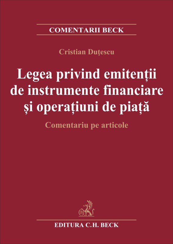 Lucrarea reprezintă un comentariu amănunțit al Legii nr. 24/2017 privind emitenții de instrumente financiare și operațiuni de piață (M.Of. nr. 213 din 29 martie 2017), autorul corelând dispozițiile actelor normative naționale referitoare la piața de capital cu cele de la nivel european și internațional. Comentariul este caracterizat de efortul analizării legislației aplicabile în prezent emitenților de instrumente financiare, fiind construit pe doi pe doi piloni: cel academic și cel practic. Astfel, sunt descrise și explicate instituții juridice esențiale ale dreptului pieței de capital, cum ar fi anumite instrumente financiare non-clasice, certificatele pentru diferență, contractele futures, opțiunile, swap-urile, instrumentele pentru transferul riscului de credit (CDS-urile), certificatele de depozit, contractele forward, dar și noțiuni importante de drept societar, precum acțiunea concertată, noțiunea de persoană controlată etc.