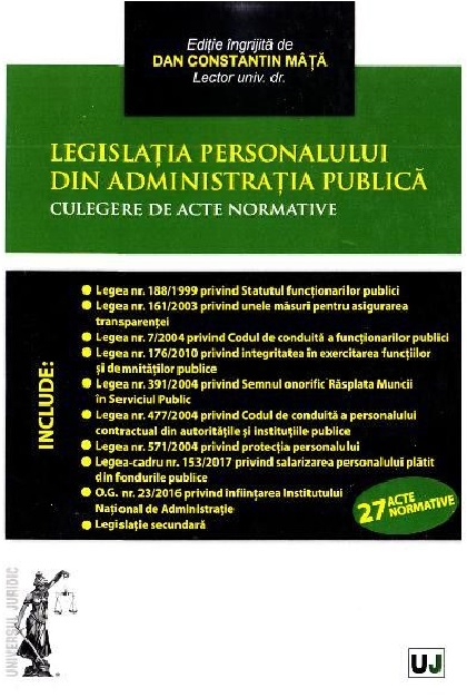 Culegerea cuprinde acte normative care reglementeaza statutul personalului din administratia publica, cu preponderenta al functionarilor publici; prezentam principalele acte normative in vigoare, adnotate cu dispozitii conexe, hotarari prealabile pentru dezlegarea unor chestiuni de drept, decizii pronuntate in interesul legii sau decizii ale instantei de contencios constitutional.