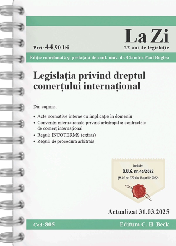 Ca atare, culegerea incearca sa cuprinda majoritatea actelor normative care intereseaza Dreptul Comertului International din perspectiva profesionistilor romani, dar, in acelasi timp, incearca sa ofere si un ghid legislativ important pentru toti aceia ce doresc sa realizeze o investitie straina in Romania sau sa intre in raporturi juridice cu subiecte de drept roman. -- Conf. univ. dr. Claudiu-Paul Buglea